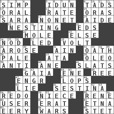 ACROSS 1. Simple or foolish person 5. Goddess of spring and wife of Bragi 9. Small boys 13. Taken by mouth 14. Pace 15. Mouths or openings 16. "Two Mules for Sister ____" 17. Music written for nine 18. Helper 19. Snuggling 21. Begley and Asner 22. Undercover agent 23. Otherwise 24. Lower and raise head in agreement 27. Directed 28. Electrical Unit 29. Came up 31. The 18th letter of the Arabic alphabet 32. Pledge 36. Diluted with white 37. _ moment's notice (2 wds.) 38. Butter sub 39. Opposed to 40. One (Scot) 41. Narrow boards 42. Greek goddess of the earth (variant) 44. Compass dir. 46. To riddle 47. Engineer (abbr.) 48. Chops off 50. Whopper 51. French poetic form 54. Redecorate 56. Sibling's daughter 58. French philosopher Descartes 60. One who makes use of a thing 61. Part of Q.E.F. 62. Inactive volcano in Sicily 63. Suggestive of the supernatural 64. Armed conflicts 65. Proofreading order DOWN 1. Distress signal 2. SW Asia republic 3. Female horse 4. Suffix with ecto or cyto 5. Pressed 6. Mild oath, euphamism for damn 7. Shoshoni 8. Fish or hair follower 9. Inedible or poisonous agaric 10. Originate 11. Male parent 12. Compass dir. 17. The longest river in the world 20. Lacquered or enameled metalware 21. Pipe bend 23. A really long time 24. California wine valley 25. NW Algerian seaport 26. Stupid person 28. By way of 30. Signiory (variant) 31. Had dinner 33. Having or resembling wings 34. Wig 35. Flexible conduit 37. Santa ___, CA 40. Wind 41. Back-to-school mo. 43. Mature 44. Chooses 45. Olfactory organ 47. A person who is older than you are 49. Fathers 51. Shrivel 52. Remaining after all deductions 53. Queen of England 1702-14 54. Sorrow 55. Compass dir. 56. ___ Haven, CT 57. Retirement account (abbr.) 59. Consume