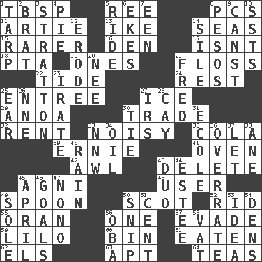 ACROSS 1. Cook's measure (abbr.) 5. Portuguese money of account (variant) 8. Personal Computers (abbr.) 11. Nick name for Arthur 13. Eisenhower's nickname 14. Oceans 15. Less widely known 16. Lair 17. Is not 18. Parent Teacher Association (abbr.) 19. Washington bills 21. Soft thread for cleaning between teeth 22. Periodic rise and fall of the sea level 24. Take ten 25. Main course 27. Frozen water 29. Small Philippine buffalo 30. Buy and sell 32. Monthly bill 33. Annoyingly loud 35. Root beer relative 39. Bert's buddy 41. Baking chamber 42. Leather borer 43. Keyboard key 45. Hindu god of fire 48. One who uses or employs something 49. Soup utensil 50. Native of Scotland 52. To free from 55. NW Algerian seaport 56. Single 57. Elude 59. _ and Stitch 60. Storage container 61. Ingested 62. Raised railways 63. Fitting 64. Beverages made from leaves DOWN 1. Canvas cover 2. Naughty child 3. Ski resort town in Vermont 4. Sliced dessert 5. Travel on an animal 6. Supplements with great effort 7. Car or cant ending 8. Mexican monetary units 9. 2nd pers. sing. pres. of can (arch.) 10. Fast planes 12. Wear away 14. Drop; flow; fall 20. Born 21. Flintstone 23. Feeling or showing extreme anger 25. Ewer handle 26. Compass dir. 27. Big collection agency 28. Island 30. Standoff 31. Learning spot: Fr. 33. Compass dir. 34. Petroleum 36. Make much ado about nothing 37. Allow 38. A saturated hydrocarbon 40. Water falling in drops from the sky 43. Superhero pair 44. First name in cosmetics 45. Showery time 46. Finish lines 47. Words to Nanette 49. Flatfish 50. Clip 51. Penny 53. The main thing one is thinking about 54. Habitations of wild animals 56. Chief or king in Benin or Nigeria 58. Large container