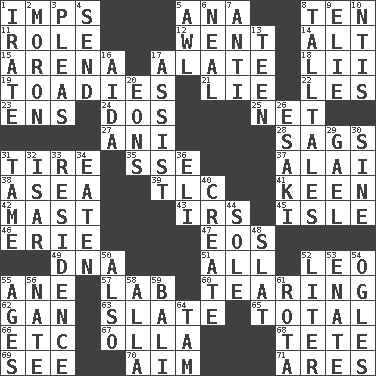 ACROSS 1. Naughty children 5. Santa ___, CA 8. Nine, plus one 11. Hero or heavy, e.g. 12. Left 14. The first octave above the treble staff 15. Sports stadium 17. Having winglike extensions 18. Cards in a Roman deck? 19. Sycophants 21. Untruth 22. French article 23. Followers of ems 24. Two (Sp.) 25. Fish or hair follower 27. Cuckoo 28. Droops 31. Become fatigued 35. Compass dir. 37. Jai ____ 38. Toward the sea 39. Affectionate concern, for short 41. Peachy ____! 42. Vertical spar for supporting sails 43. Big collection agency 45. Capri or Wright 46. One of the Great Lakes 47. Greek goddess of the dawn 49. Heredity factor (abbr.) 51. 100% 52. Lion 55. A saturated hydrocarbon 57. Experiment locale 60. Separating forcefully 62. Separate the seeds from cotton 63. Chalkboard 65. Add up to 66. And so on (abbr.) 67. Spanish pot 68. Wig 69. Observe 70. Direct toward a target or goal 71. Ancient Greek god of war DOWN 1. Feeling or showing extreme anger 2. Person of subnormal intelligence 3. Entreaties 4. Post 5. Leather borer 6. Actress Patricia 7. Against 8. Baron Munchausen's specialties 9. Writer Wiesel 10. Nuclear Threat Initiatives 13. Adolescent 16. Opera by Verdi 17. Aid 20. Immeasurably long periods of time 26. 1973 Nobel Price Winner (Physics) Leo 29. Highlander 30. Trig term 31. Not wild 32. Austrian river, tributary to the Danube 33. Dwelling 34. Ingested 36. Connecticut Ivy Leaguer 40. Cause to be 44. Not divided or shared with others 48. Narrow board 50. In addition 52. 61 cubic inches 53. Related on the mother's side 54. Stares 55. Eras 56. Nathan's nickname 58. Silent film actress Nazimova 59. Indonesian resort city 61. Roll call or roster of names 64. Scottish cap