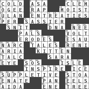 ACROSS 1. Chilled 5. White ___ sheet 8. To starve (Brit.) 12. Double curve, resembling the letter S 13. Hit sharply and swiftly 14. Wet 15. ____ Bator, Mongolia 16. Pleas 19. For each 20. More lively and spirited 21. In a ____ (agitated or irritated) 23. Heredity factor (abbr.) 24. Born 27. Friends 30. Electrical Unit 31. Eats (away) 34. Son of Isaac 35. Drug cop 38. Falsehoods 40. Painter Guido (1575-1642) 41. Operatic vocal solo 42. Baby cat 44. Baby powder 45. "Two Mules for Sister ____" 46. Sight organ 47. Mayday 50. Capri or Wright 53. Motivate 57. Frozen water 59. Supplying deficiencies 63. Portico 64. Related on the mother's side 65. Baking dish 66. Snakelike fish 67. Opera by Verdi 68. Compass dir. 69. Family _ (genealogy) DOWN 1. Overturn; upset 2. Stares at amorously 3. Acquire or gain knowledge or skills 4. Lair 5. Type of rug 6. Without 7. Flats, for short 8. Small bed 9. Cards in a Roman deck? 10. Compass dir. 11. Mountains (abbr.) 14. Hindu Mythology: god of death 17. To free from 18. Car or cant ending 20. Play the lead 22. Medicinal drug used to evoke vomiting 24. Sense of smell 25. Flair 26. Needle holder 28. Car dealer's back yard 29. Neighbor of Neb. 30. Actresses Bloom and Felton 32. Connecticut Ivy Leaguer 33. Puts into a specified state 35. Nathan's nickname 36. Like ___ of sunshine 37. Cause heat under the collar 39. R.R. building 43. 4th largest of the Great Lakes 47. Drop; flow; fall 48. Single 49. Fast jet (abbr.) 51. 61 cubic inches 52. Learning spot: Fr. 54. Corncob 55. "Terrible" tsar 56. French philosopher Descartes 58. Relaxation 59. Ocean 60. Corn or form start 61. Groovy apt. 62. Parent Teacher Association (abbr.) 63. Put into a specified state