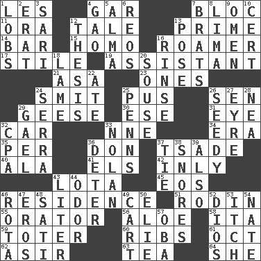 ACROSS 1. French article 4. Slender fish 7. Coalition 11. Mouth or opening 12. Lie 13. A-one 14. Long, evenly shaped piece 15. Like (prefix) 16. Wanderer 17. Vertical member of a panel or frame 19. Aide 21. White ___ sheet 23. Singles 24. Stricken, poetically 25. Fluid product of inflammation 26. Elected rep. 29. Honkers 30. Compass dir. 31. Sight organ 32. 4-wheeled motor vehicle 33. Compass dir. 34. Epoch 35. For each 36. Spanish title 37. Sadhe (variant) 40. Insect wing 41. Raised railways 42. Inwardly 43. Globular water bottle used in Asia 45. Greek goddess of the dawn 46. Dwelling 51. "The Thinker" sculptor 55. Speaker 56. Medicinal plant 58. Call ___ day 59. Carrier 60. Teases 61. Sep. follower 62. SW Saudi Arabia district 63. Beverage made from leaves 64. A female animal or person DOWN 1. Tennis shots 2. Part of Q.E.F. 3. Indian skirt 4. E Mali city 5. _ mater 6. Vintage cars 7. Naughty children 8. Pale green bean 9. Presage 10. Sure thing 12. College paper 13. Introduce or present, as a question 16. Remove soap 18. Unable to walk 20. Boozer 22. Had dinner 24. Father Junipero _ 25. Actor Sean's family 26. Sleazy 27. Jane of fiction 28. Teachers' org. 29. Highlander 32. Numbers guy (abbr.) 33. Pitcher Ryan 36. Prevent from occurring 37. Neckwear 38. Sounds asleep 39. In addition 43. 61 cubic inches 44. Scent 46. Round or rotation of duties 47. Greek god of love 48. Suttee (variant) 49. Heavy open wagon 50. Writer Wiesel 52. "Vaya con ____" 53. Hankering 54. Nathan's nickname 57. Chief or king in Benin or Nigeria