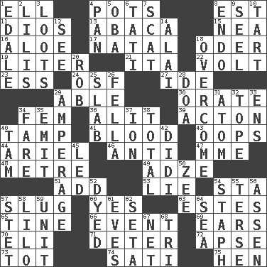 ACROSS 1. Pipe bend 4. Cooking vessels 8. Eastern Standard Time (abbr.) 11. "Vaya con ____" 13. Phillipine bananalike plant 15. Teachers' org. 16. Medicinal plant 17. Brizilian seaport 18. River in Europe 19. 61 cubic inches 21. Call ___ day 22. Electrical Unit 23. Double-curved letter 24. Order of Saint Francis (abbr.) 27. Binary compound 29. Competent 30. Declaim 34. Opposite of masc. 36. Came down and settled, as after flight 39. NE Massachussets city 40. Pack (down) 41. Vital fluid 43. I made a mistake 44. Satellite of Uranus 46. Against 47. Madame (abbr.) 48. Distance measurement (Brit.) 49. Axlike tool, used for shaping wood 51. Increase 53. Untruth 54. R.R. building 57. A hard, heavy blow 60. Consenting reply 63. _____ Park, CO 65. Prong on a fork 66. Incident 69. Hearing organs 70. Connecticut Ivy Leaguer 71. Prevent from occurring 72. Domed church section 73. Small child 74. Suttee (variant) 75. Layer DOWN 1. Peak District village in England 2. Ms. Damita and namesakes 3. Plunders 4. Baking dish 5. Chief or king in Benin or Nigeria 6. Jacques of French films 7. Scram! 8. Inside; within (prefix) 9. Sew up the eyelids of hawks and falcons 10. Small pie 12. Observe 14. Mountain range southwest of Kyrgyzstan 18. Conquer 20. Director Reiner 25. Thick slice 26. Chap (slang) 28. ___ good deed 29. Electrical Measurement 31. Smallest unit of an element 32. Drink excessively 33. Followers of ems 34. Conductor's collection 35. Send forth 37. Electrically charged atom 38. Add up to 40. Scottish cap 42. "You Light Up My Life" star Conn 45. Directed 50. Last letter of the English alphabet 52. Colored 54. Staphylococcus 55. Laconic 56. NE Netherlands city 57. Proofreading order 58. _ and Stitch 59. A single undivided whole 61. Nights before holidays 62. Bristle 64. Ocean 67. Fish or hair follower 68. Three (prefix)