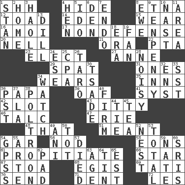 ACROSS 1. Quiet! 4. Flintstone garb 8. Inactive volcano in Sicily 12. Frog relative 14. Paradise 15. Erode 16. Mine, in Marseilles 17. Unrelated to defense, as in spending 20. 1994 drama film starring Jodie Foster 21. Mouth or opening 22. Parent Teacher Association (abbr.) 23. Voters do this 27. Queen of England 1702-14 29. Petty quarrel 31. Singles 34. Puts on (as clothing) 35. Restaurants 36. Dad 39. Clumsy lout 41. System (abbr.) 42. Groove 43. Simple song 46. Baby powder 47. One of the Great Lakes 48. Not this but _ 51. Intended 54. Slender fish 56. Lower and raise head in agreement 58. Immeasurably long periods of time 61. Appease 66. Play the lead 67. Portico 68. The front part of a cuirass 69. Jacques of French films 70. Post 71. Incision 72. French article DOWN 1. Comedian Laurel of Laurel & Hardy 2. Residence 3. White Person, in Hawaii 4. Layer 5. Wedding promise 6. Lair 7. Inside; within (prefix) 8. She-sheep 9. 3-inch nail 10. Political cartoonist Thomas 11. Length times width 13. Deli pickle 18. Epoch 19. Air blower 24. Compass dir. 25. Accounting whiz (abbr.) 26. Pacific island yam 28. Annoyingly loud 30. Sadhe (variant) 32. Followers of ems 33. Fast jet (abbr.) 34. Timepiece 36. Pacific Standard Time (abbr.) 37. Chicken ___ king 38. Coward 40. Not soft or yielding to pressure 44. Make a knot 45. Beverage made from leaves 49. Cuckoo 50. Small child 52. A home for chicks 53. Add up to 54. Global Positioning Systems (abbr.) 55. Johnson of "Laugh-In" 57. Passed on 59. Nathan's nickname 60. Indian titles of respect 62. Writing tablet 63. Ripen 64. Metal container 65. Eastern Standard Time (abbr.)