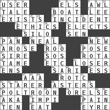 ACROSS 1. One who uses or employs something 5. Raised railways 8. Leather borer 11. Story 12. Water vessel 13. Area sheltered from the wind 14. Is 17. Event 19. Value system 21. Opts 22. Grain storage tower 23. Elected rep. 24. Baking dish 27. Be tempered by heat 29. ___ Haven, CT 32. Came up 34. Friend of Pooh 36. Airs 37. Title for a man of rank and authority 38. Mayday 39. Roll call or roster of names 40. Docile 41. And so on (abbr.) 42. Failure 43. Followers of ems 44. Indian skirt 46. Double-curved letter 47. Auto club (abbr.) 50. College mil. group 52. A viewer who gazes fixedly 55. Michaelmas daisies 57. Coward 59. Threatening words 62. Alias (abbr.) 63. Body of Kaffir warriors 64. Ache 65. Nine, plus one 66. Erode 67. Jane of fiction DOWN 1. Shoshoni 2. Saxophone 3. Writer Wiesel 4. Musical pauses 5. Age 6. Shoestrings 7. Vertical member of a panel or frame 8. Actor Baldwin 9. Left 10. Allows 12. Twice 15. One or ones belonging to thee 16. Filth; sediment 18. Lair 20. Unrefined 24. Thick mixture 25. Believer in; advocate of (suffix) 26. Typical models 28. Plunders 29. Trap for birds or small mammals 30. _____ Park, CO 31. Erodes 33. Perceive with the eye 35. Motion picture awards 36. Adept person 42. 61 cubic inches 45. Printing process, for short 47. Tate display 48. Nest on high 49. Odor 51. Streamer paper 52. Petty quarrel 53. Puff or smoke 54. Actor Alda or Thicke 55. Black tropical American cuckoo 56. Kill 58. Elect 60. Title for a knight 61. Compass dir.