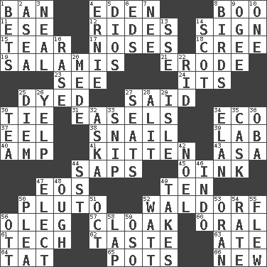 ACROSS 1. Prohibit 4. Locale of original sin 8. Oct. 31 cry 11. Compass dir. 12. Amusement-park features 14. Signal 15. Pull into pieces 17. Olfactory organs 18. Algonquian 19. Deli grouping 21. Wear away 23. Observe 24. It is 25. Colored 27. Stated 30. Neckwear 31. Artist's stands 34. Environmental prefix 37. Snakelike fish 38. Slow-paced one 39. Experiment locale 40. Electrical Unit 41. Baby cat 43. White ___ sheet 44. Plant excrements 45. Pig sound 47. Greek goddess of the dawn 49. "___ Little Indians" 50. Mickey's pet 52. Apple salad 56. Cassini of fashion 57. Cover or conceal 60. Relating to the mouth 61. Technician 62. Clothes sense 63. Had dinner 64. Make lace 65. Cooking vessels 66. ___ Haven, CT DOWN 1. Wagers 2. At sea 3. Be tempered by heat 4. Bert's buddy 5. "Vaya con ____" 6. Begley and Asner 7. Born 8. Avian creatures 9. Double curve, resembling the letter S 10. Single 13. Compass dir. 14. Highlander 16. Raze (variant) 20. Ancient Persian 22. To free from 25. South Vietnam president (1954) 26. Sharp bark 27. Theater features 28. Set down 29. Capri or Wright 30. Beverage made from leaves 32. "____ silly question..." 33. Clip 34. Flair 35. Keg 36. Chief or king in Benin or Nigeria 42. Christmas carol 44. Fast jet (abbr.) 46. _ china 47. Voters do this 48. Ending for "Through" and "Enough" 49. Proceeds 50. Entreaty 51. Sep. follower 52. Electrical Unit 53. NW Algerian seaport 54. Assign a rank or rating to 55. Soared 56. Baseball player Mel 58. Infant locale 59. Bear (Spanish)