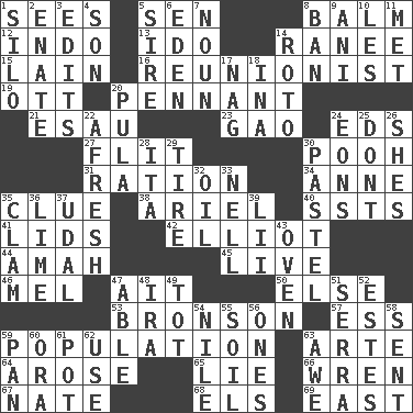 ACROSS 1. Perceives with the eye 5. Elected rep. 8. Lip ointment 12. Southeast Asian peninsula 13. Wedding promise 14. Indian princess (variant) 15. (Had) reclined 16. One who advocates reunion 19. Baseball player Mel 20. Pre-World Series prize 21. Son of Isaac 23. E Mali city 24. Begley and Asner 27. Sudden quick movement 30. "Silly old bear" 31. Food allowance for one day 34. Singer Murray 35. A slight indication 38. Satellite of Uranus 40. Fast planes 41. Flaplike coverings 42. American author Paul (1891-1958) 44. Wet nurse 45. Moving, as bait 46. Cartoonist voice _ Blanc 47. Small island 50. Otherwise 53. "Death Wish" actor 57. Curvy letter 59. Census information 63. Johnson of "Laugh-In" 64. Came up 65. Whopper 66. Songbird 67. Nathan's nickname 68. Raised railways 69. 90 degrees DOWN 1. Grain storage tower 2. Related on the mother's side 3. Proofreads 4. Boy, to dad 5. Male parent of an animal 6. Locale of original sin 7. Part of speech 8. Prohibit 9. Cuckoo 10. French article 11. Was introduced to 14. Printing process, for short 17. Tired old horse 18. _ tizzy (2 wds.) 20. Monetary unit of Botswana 22. Anew 24. Immeasurably long periods of time 25. Do not 26. "______ My Girl" (Turtles hit) 28. Call ___ day 29. Become fatigued 30. Soft color 32. Petroleum 33. 1994 drama film starring Jodie Foster 35. Dollar (slang) 36. Welles in "The Third Man" 37. Freehold land 39. Cards in a Roman deck? 43. Baking chamber 47. Competent 48. Lyricist Gershwin 49. Small child 51. Father Junipero _ 52. _____ Park, CO 54. The longest river in the world 55. The visible part of the earth's surface 56. Washington bills 58. Emitted 59. Baking dish 60. Mouth or opening 61. Cooking vessel 62. Purpose 63. Deep reverence