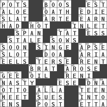 ACROSS 1. Cooking vessels 5. Scornful sounds 9. Eastern Standard Time (abbr.) 12. _ vera 13. Pledge 14. Singer Brickell 15. Narrow board 16. Johnson of "Laugh-In" 17. Merit 18. Possessed 19. Being at a high temperature 21. An arm off of a larger body of water 22. Connect, as a bridge 24. Make lace 26. Curvy letter 27. Showing deterioration from age 28. Sty mamas 29. Within a short period 30. Burn superficially 32. Domed church section 36. Narrow opening 37. ___ good deed 38. Roberta Peters solo 39. Snakelike fish 40. Laconic 42. Monthly bill 43. Naughty child 44. Came up 46. Turn to the right 49. Petroleum 50. Painter Guido (1575-1642) 51. Thoroughly unpleasant 53. Compass dir. 54. Heredity factor (abbr.) 57. "Beetle Bailey" pooch 58. Silent film actress Nazimova 61. Adolescent 62. Confront 63. Institutes legal proceedings 64. To the inside or interior of 65. Followers of ems 66. Mail 67. Singer James DOWN 1. Romantic infatuation 2. Spanish pot 3. Inedible or poisonous agaric 4. Arrange properly for use 5. Water vessel 6. Boat paddle 7. Baseball player Mel 8. A female animal or person 9. Peak District village in England 10. Male parents of animals 11. Portable shelters 14. Car or cant ending 19. Actor Linden 20. Singles 21. ___ a Wonderful Life 23. Leg coverings 24. Ancient Roman robes 25. Deep reverence 27. Not divided or shared with others 28. Derisive sound 29. Compass dir. 31. Perfect 32. Composer Copland 33. Elected leader of a country 34. Trig term 35. Erode 40. Three (prefix) 41. Hearing organs 43. Male child 45. To riddle 46. Dwarf 47. Eroded 48. _____ Park, CO 52. Small child 53. Compass direction 55. Remaining after all deductions 56. Small Philippine buffalo 58. Cleo's killer 59. Nilotic language 60. French article 61. Neckwear
