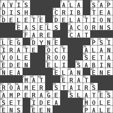 ACROSS 1. Opinion 5. Chicken ___ king 8. Plant excrement 11. Food container 12. Baby bed with high sides 13. Afternoon social gathering 14. Keyboard key 17. Accusation by an informer 19. Artist's stands 21. Oak nuts 22. Conductor's collection 23. Domesticated feline 24. Part of a journey 27. Centimeter-gram-second unit of force 29. Air pressure measure (abbr.) 32. Feeling or showing extreme anger 34. Sep. follower 36. Actor Alda or Thicke 37. Short-tailed, large-bodied rat 38. Friend of Pooh 39. Stalk of a moss capsule 40. Paradise 41. Biblical high priest 42. Unit of acoustic absorption 43. Teachers' org. 44. Enthusiasm 46. Compass dir. 47. Floor protector 50. Part of Q.E.F. 52. Nomad 55. Flight of steps 57. Electrical Measurement 59. Chalkboards 62. Arrange properly for use 63. The content of cognition 64. Undercover agent 65. Followers of ems 66. Car or cant ending 67. Diluted with white DOWN 1. Find the sum of 2. Compete 3. Capri or Wright 4. To gather and bind into a bundle 5. "We ___ not amused" (Victoria) 6. Pale purple color 7. Phillipine bananalike plant 8. Move through with a circular motion 9. Age 10. Zero-star reviews 12. Music discs 15. Sadhe (variant) 16. Suggestive of the supernatural 18. Small child 20. Poe poem 24. Make or become more lively 25. Eat (away) 26. An organ shaped like a helmet 28. Learning spot: Fr. 29. Military trainee 30. Smooth fabric 31. Lacking in sense or substance 33. "___ Little Indians" 35. Rest room 36. White ___ sheet 42. Slow-paced one 45. Ancient river in northeast Turkey 47. Madame (abbr.) 48. Nest on high 49. Barter 51. _____ steamer (cargo ship) 52. Raze (variant) 53. Sign of something about to happen 54. Tenement units (abbr.) 55. Ocean 56. Portico 58. Commissioned mil. rank 60. Pipe bend 61. Observe