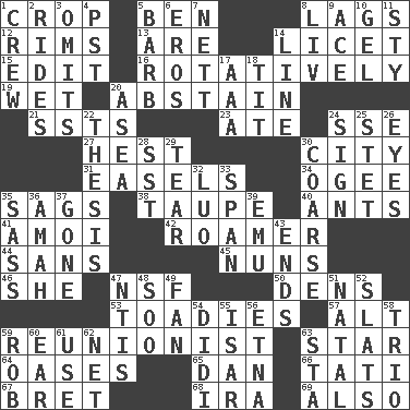 ACROSS 1. Riding implement 5. Benjamin's nick name 8. Falls behind 12. Basketball hoops 13. "We ___ not amused" (Victoria) 14. It is permitted: Lat. 15. Prepare for publication 16. Happening in regular succession 19. Dripping 20. Refrain by choice 21. Fast planes 23. Had dinner 24. Compass dir. 27. Behest 30. Municipality 31. Artist's stands 34. Double curve, resembling the letter S 35. Sinks 38. Grayish beige 40. Pismires 41. Mine, in Marseilles 42. Wanderer 44. Without 45. Religious women 46. A female animal or person 47. Overdraft (abbr.) 50. Habitations of wild animals 53. Sycophants 57. The first octave above the treble staff 59. One who advocates reunion 63. Play the lead 64. Fertile tracts in a desert 65. One of the 12 tribes of Israel 66. Jacques of French films 67. Cy Young winner Saberhagen 68. Retirement account (abbr.) 69. In addition DOWN 1. Group working together 2. Amusement-park features 3. Leaves out 4. Pacific Standard Time (abbr.) 5. Sharp remark 6. Greek god of love 7. Remaining after all deductions 8. 54 in ancient Rome 9. Adept person 10. Set 11. Filthy place 14. Actor's bit 17. Auto club (abbr.) 18. Teat (slang) 20. At sea 22. College paper 24. Attach a signature 25. Proofreading order 26. Sight organs 28. Fast jet (abbr.) 29. Separate forcefully 30. Unrefined 32. Nilotic language 33. Connect, as a bridge 35. Backtalk 36. Nanny 37. Went 39. Australian flightless bird 43. Conclusions 47. Nuclear Threat Initiatives 48. "Barney Miller" actor Jack 49. Avid follower 51. Brizilian seaport 52. Narrow boards 54. "You Light Up My Life" star Conn 55. Austrian river, tributary to the Danube 56. Inactive volcano in Sicily 58. Musical group of three 59. Director Reiner 60. Ewer handle 61. Purpose 62. Fish or hair follower 63. R.R. building