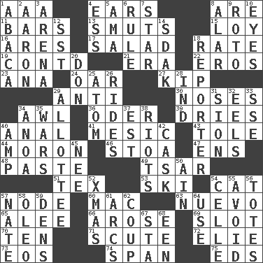 ACROSS 1. Auto club (abbr.) 4. Hearing organs 8. "We ___ not amused" (Victoria) 11. Drinking establishments 13. Obscenities 15. Myrna of the movies 16. Ancient Greek god of war 17. Vegetable dish 18. Pace 19. Continued (abbr.) 21. Period 22. Greek god of love 23. Santa ___, CA 24. Rowing implement 27. Sleep 29. Opposed to 30. Olfactory organs 34. Leather borer 36. River in Europe 39. Frees from moisture 40. Of or related to the anus 41. Mesonic 43. Lacquered or enameled metalware 44. Person of subnormal intelligence 46. Portico 47. Followers of ems 48. Thick mixture 49. Russian ruler of old 51. John Ritter's dad 53. What Jean-Claude Killy likes to do 54. Domesticated feline 57. Thickened enlargement 60. Apple computer (short form) 63. New (sp.) 65. Toward shelter 66. Came up 69. Notch 70. Nine, plus one 71. Scutum 72. Writer Wiesel 73. Greek goddess of the dawn 74. Connect, as a bridge 75. Begley and Asner DOWN 1. Phillipine bananalike plant 2. Composer Copland 3. Sports stadium 4. Double-curved letter 5. Wet nurse (var.) 6. Court order 7. Play the lead 8. Having or resembling wings 9. Printing process, for short 10. Snake ____ (dice throw) 12. Fast jet (abbr.) 14. Neighbor of Neb. 18. Newsperson 20. Spanish title 25. Smallest unit of an element 26. Amusement-park features 28. Working for oneself (abbr.) 29. One to whom something is allotted 31. The Jewish people; Israel 32. Snakelike fish 33. Compass dir. 34. Small Philippine buffalo 35. Armed conflicts 37. Eastern Standard Time (abbr.) 38. Debaucheries 40. Electrical Unit 42. Keg 45. Born 50. The 18th letter of the Arabic alphabet 52. Dec. holiday 54. Cell (Danish) 55. Shun 56. Hauls 57. Nathan's nickname 58. Butter sub 59. Hiding places for outlaws 61. Curves 62. Overturn; upset 64. Purpose 67. R.R. building 68. Car or cant ending
