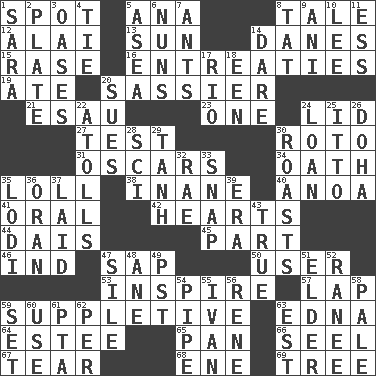 ACROSS 1. Blemish 5. Santa ___, CA 8. Falsehood 12. Jai _ 13. Player for Phoenix 14. Natives or inhabitants of Denmark 15. To erase 16. Pleas 19. Had dinner 20. More impudent 21. He sold his birthright 23. Single 24. Hat (slang) 27. Trial 30. Printing process, for short 31. Motion picture awards 34. Pledge 35. Hang loosely or laxly 38. Empty; void 40. Small Philippine buffalo 41. Of the mouth 42. Centers 44. Raised platform 45. Component 46. Indiana (abbr.) 47. Plant excrement 50. One who makes use of a thing 53. Stimulate to action 57. Pet locale 59. Supplementary 63. Pulitzer Prize-winning author Ferber 64. First name in cosmetics 65. Baking dish 66. Stitch closed the eyes of (a falcon) 67. Pull apart 68. Compass dir. 69. Family _ (genealogy) DOWN 1. "Two Mules for Sister ____" 2. Food holder 3. Fertile tracts in a desert 4. Neckwear 5. At sea 6. Religious women 7. Pismires 8. Make lace 9. Cuckoo 10. Area sheltered from the wind 11. Double-curved letter 14. Have the gumption 17. _ de Janeiro 18. Car or cant ending 20. Takes to court 22. Ringlike coral islands and reefs 24. Grant temporary use of 25. "Tell ____ the Marines!" 26. Capital of the state of Qatar 28. _-fi 29. Hyperbolic tangent 30. Cooks with dry heat, as in an oven 32. Actress Charlotte 33. Fastener 35. Farming town in central California 36. NW Algerian seaport 37. Put down 39. Epoch 43. Loyal 47. Filth; sediment 48. One (Scot) 49. Pacific Standard Time (abbr.) 51. A person who is older than you are 52. The wife of a rajah (variant) 54. Corncob 55. "Terrible" tsar 56. French philosopher Descartes 58. Light colored 59. Arrange properly for use 60. Purpose 61. Parent Teacher Assoc. 62. For each 63. Eastern Standard Time (abbr.)