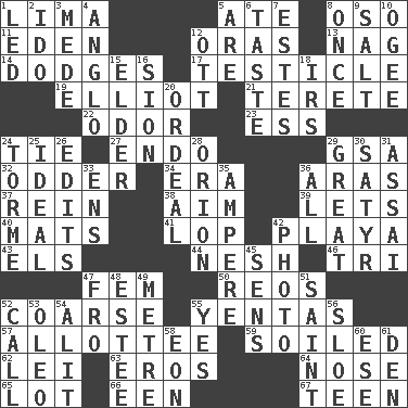 ACROSS 1. Pale green bean 5. Had dinner 8. Bear (Spanish) 11. Locale of original sin 12. Mouths or openings 13. Tired old horse 14. Evades 17. A testis 19. American author Paul (1891-1958) 21. Cigar-shaped 22. Scent 23. Double-curved letter 24. Neckwear 27. Inside; within (prefix) 29. Girls' org. (abbr.) 32. More peculiar 34. Epoch 36. Ancient river in northeast Turkey 37. It's straight from the horse's mouth 38. Direct toward a target or goal 39. Allows 40. Floor coverings 41. Chop off 42. Beach, in Buenos Aires 43. Raised railways 44. Delicate 46. Three (prefix) 47. Opposite of masc. 50. Vintage cars 52. Unrefined 55. Gossips 57. One to whom something is allotted 59. Dirtied 62. Luau accessory 63. Greek god of love 64. Characteristic smell of wine 65. Car dealer's back yard 66. Car or cant ending 67. Adolescent DOWN 1. Directed 2. Wedding promise 3. Ancient Persian 4. White American of non-Hispanic descent 5. "We ___ not amused" (Victoria) 6. Clothes sense 7. _____ Park, CO 8. Single time 9. Table seasoning 10. Double curve, resembling the letter S 12. Baseball player Mel 15. A person who is older than you are 16. The Jewish people; Israel 18. Big collection agency 20. Severe or trying experience 24. Singer Mel 25. Perfect 26. Prepares for publication 28. Constellation of myth 29. Relatively large 30. Letch 31. Slender Brazilian palm 33. Followers of ems 35. Electrical Unit 36. 100% 42. Picture 45. Elected reps. 47. From 48. First name in cosmetics 49. Distance measurement (Brit.) 51. Inhabitant of Heaven 52. Give a ring to 53. Margarine 54. Set down 55. Consenting reply 56. _ gin 58. Period of immesurable duration 60. Compass dir. 61. Lair