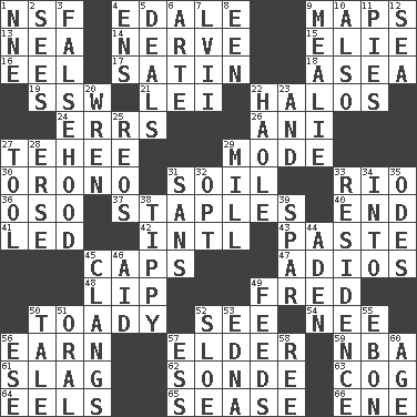 ACROSS 1. Science/research agcy. 4. Peak District village in England 9. Atlas contents 13. Teachers' org. 14. Effrontery 15. Writer Wiesel 16. Snakelike fish 17. Smooth fabric 18. Toward the sea 19. Compass dir. 21. Luau accessory 22. Rings 24. Blunders 26. Black tropical American cuckoo 27. Giggle 29. Method 30. U. of Maine site 31. The visible part of the earth's surface 33. _ de Janeiro 36. Bear (Spanish) 37. Paper fasteners 40. Conclude 41. Directed 42. International (abbr.) 43. Thick mixture 45. Smile enhancers 47. Goodbye (Sp.) 48. Mouth edge 49. Flintstone 50. Sycophant 52. Observe 54. Born 56. Merit 57. A person who is older than you are 59. Basketball assoc. 61. Volcanic refuse 62. Something which is sent 63. Gear tooth 64. Snakelike fish 65. Gospel singer Marvin 66. Compass dir. DOWN 1. Compass dir. 2. Observes 3. It jiggles the polygraph 4. Followers of ems 5. Allots cards 6. Johnson of "Laugh-In" 7. 57 in ancient Rome 8. Car or cant ending 9. Ear of corn 10. In addition 11. Sliced desserts 12. Ocean 20. Songbird 22. White Person, in Hawaii 23. Also 25. Vintage cars 27. Utensil 28. Celtic language 29. Place where flour is made 31. Without 32. Elect 33. Dwelling 34. To the inside or interior of 35. Lyric poems 38. Likely to tip or tilt 39. Practice fight 44. An important port of Yemen 45. Rigngs loudly 46. Assist 49. Eats 50. Falsehood 51. Of the mouth 52. A type of plum 53. Pulitzer Prize-winning author Ferber 55. Inky black, to poets 56. Compass dir. 57. Curvy letter 58. To riddle 60. Ripen