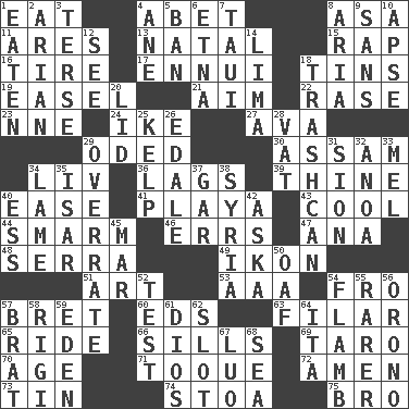 ACROSS 1. Ingest 4. Collude with 8. White ___ sheet 11. Ancient Greek god of war 13. Relating to or accompanying birth 15. Strike 16. Become fatigued 17. World-weariness 18. Canisters 19. Artist's stand 21. Direct toward a target or goal 22. Raze (variant) 23. Compass dir. 24. D.D.E's nickname 27. Actress Gardner 29. Wrote a lyric poem 30. Indian state 34. 54 in ancient Rome 36. Falls behind 39. One or ones belonging to thee 40. Comfort 41. Beach, in Buenos Aires 43. Calm and collected 44. Excessive but superficial compliments 46. Blunders 47. Santa ___, CA 48. Spanish missionary in California 49. Image 51. Tate display 53. Auto club (abbr.) 54. Away 57. Cy Young winner Saberhagen 60. Begley and Asner 63. Having threads 65. Travel on or in a vehicle 66. Beverly of Met fame 69. Edible starchy tuberous root 70. Grow older 71. Woman's close-fitting hat 72. So be it 73. Metal container 74. Portico 75. Sis' sibling DOWN 1. Eroded 2. Believer in; advocate of (suffix) 3. Laconic 4. One (Scot) 5. Bar 6. Inactive volcano in Sicily 7. "Change" in Tahitian 8. Operatic vocal solo 9. Without 10. Domed church section 12. Perceive with the eye 14. Pale green bean 18. File 13 20. Hat (slang) 25. Seaweed 26. Peak District village in England 28. Large container 29. Make much ado about nothing 31. The Jewish people; Israel 32. Small Philippine buffalo 33. Cartoonist voice _ Blanc 34. Unable to walk 35. Austrian river, tributary to the Danube 37. Slender fish 38. Damascus' land 40. Double-curved letter 42. "____ silly question..." 45. Make imperfect 50. Clumsy lout 52. Trial 54. Flambe (short form) 55. More valued for its uncommonness 56. U. of Maine site 57. Naughty child 58. Swiss mountan, "Queen of the Mountains" 59. Paradise 61. "Vaya con ____" 62. Slit 64. Call ___ day 67. Nilotic language 68. Ocean
