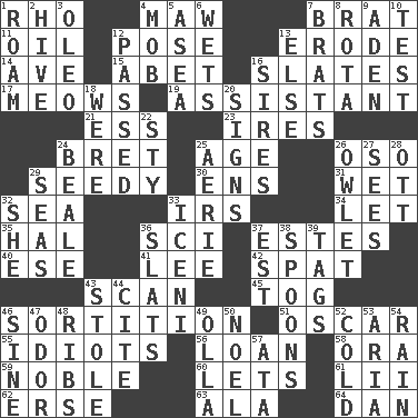 ACROSS 1. 17th letter of the Greek alphabet 4. Opening into something insatiable 7. Naughty child 11. Lubricate 12. Airs 13. Wear away 14. "___ Maria" 15. Collude with 16. Chalkboards 17. Catcalls? 19. Aide 21. Curvy letter 23. Angers 24. Cy Young winner Saberhagen 25. Personal question 26. Bear (Spanish) 29. Shabby and untidy 30. Followers of ems 31. Dripping 32. Ocean 33. Big collection agency 34. Allow 35. Actor Linden 36. _-fi 37. _____ Park, CO 40. Compass dir. 41. Area sheltered from the wind 42. Petty quarrel 43. Examine minutely or intensely 45. Coat; cloak 46. Decision 51. Witty Wilde 55. Foolish or stupid persons 56. Grant temporary use of 58. Mouth or opening 59. Having high moral qualities 60. Allows 61. Cards in a Roman deck? 62. Celtic language 63. Wing 64. Daniel's nick name DOWN 1. Wander 2. Hub of activity 3. Margarine 4. Disorderly crowd 5. Toward the sea 6. Soaks 7. Naughty children 8. Round or rotation of duties 9. Arabian gulf 10. Trial 12. Went by 13. Otherwise 16. Fathers 18. We are 20. Attaches a signature 22. Filthy place 24. Calif. Air Force Base 25. Nest on high 26. A small or young owl 27. Perceives with the eye 28. Baseball player Mel 29. Oceans 32. A female animal or person 33. Ancient Celtic tribe of eastern Britain 36. Narrow boards 37. Eastern Standard Time (abbr.) 38. Soup utensils 39. Labels 43. Took without asking 44. Quote 46. Trig term 47. Aroma 48. Teases 49. Spanish pot 50. Christmas carol 52. Chilled 53. Roberta Peters solo 54. Precipitation 57. "One Day ___ Time"