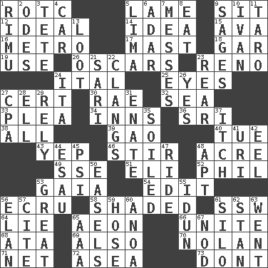 ACROSS 1. College mil. group 5. Unable to walk 9. Be seated 12. Standard of perfection 14. It may be bright or harebrained 15. Actress Gardner 16. Paris' subway 17. Vertical spar for supporting sails 18. Slender fish 19. Purpose 20. Motion picture awards 23. Former U.S. Attorney General Janet 24. Slanted text style (abbr.) 25. Snake ____ (dice throw) 27. An absolute certainty 30. Actress Charlotte 32. Ocean 33. Entreaty 34. Restaurants 36. Indian title of respect (Mr.) 38. 100% 39. E Mali city 40. Third day of the wk. 43. Slangy assent 46. Use a spoon 48. 1/640 square mile 49. Compass dir. 51. Connecticut Ivy Leaguer 52. Silvers or Donahue 53. Greek goddess of the earth (variant) 54. Prepare for publication 56. Shade of tan 58. Cast a shadow over 61. Compass dir. 64. Whopper 65. Period of immesurable duration 66. Join together 68. _ moment's notice (2 wds.) 69. In addition 70. Pitcher Ryan 71. Fish or hair follower 72. At sea 73. Do not DOWN 1. Tall New Zealand timber tree 2. Lyric poems 3. False hair 4. Automobile 5. Pale green bean 6. The sixth month of the Jewish calendar 7. Makes clutter 8. Ingest 9. Gurus 10. _ the terrible 11. Edible starchy tuberous root 13. Spoils 21. Indian skirt 22. Gives out a loud, resonant sound 23. Stern 24. Call ___ day 26. Consenting reply 27. Numbers guy (abbr.) 28. Pipe bend 29. Have trust in 31. Related on the mother's side 35. Dirtied 37. Hankering 41. RI univ. 42. Snakelike fish 44. He sold his birthright 45. Air pressure measure (abbr.) 47. Travel on or in a vehicle 48. Fitting 50. Artist's stands 53. Relatively large 55. Goddess of spring and wife of Bragi 56. Liveliness 57. Quote 59. Stockings 60. Small Philippine buffalo 61. Grain storage tower 62. Comedian Laurel of Laurel & Hardy 63. Left 65. Auto club (abbr.) 67. Lower and raise head in agreement