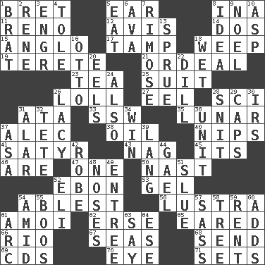 ACROSS 1. Cy Young winner Saberhagen 5. Hearing organ 8. _ tizzy (2 wds.) 11. Former U.S. Attorney General Janet 12. Opinion 14. Two (Sp.) 15. White American of non-Hispanic descent 17. Pack (down) 18. Shed a tear 19. Cylindrical with tapered ends 21. Severe or trying experience 23. Afternoon social gathering 25. Set or collection 26. Hang loosely or laxly 27. Snakelike fish 28. _-fi 31. _ moment's notice (2 wds.) 33. Compass dir. 35. Type of eclipse 37. Actor Baldwin 38. Petroleum 40. Pinches, bites 41. Man with strong sexual desires 43. Tired old horse 45. It is 46. "We ___ not amused" (Victoria) 47. Single 50. Political cartoonist Thomas 52. Inky black, to poets 53. Set 54. Most capable 56. A period of five years 61. Mine, in Marseilles 62. Celtic language 65. Having ears or earlike features 66. River (Sp.) 67. Oceans 68. Transmit 69. Music discs 70. Sight organ 71. Arranges properly for use DOWN 1. Naughty child 2. French philosopher Descartes 3. Engineer (abbr.) 4. Lacquered or enameled metalware 5. Consume 6. Actress Gardner 7. Full of chinks, cracks, or crevices 8. The main thing one is thinking about 9. Christmas carol 10. Cleo's killer 13. Upset 16. "Beetle Bailey" pooch 18. Soggy 20. Snakelike fish 22. Deli pickle 24. In addition 26. Made of lace 28. In a ____ (agitated or irritated) 29. Smile enhancers 30. Big collection agency 31. Having or resembling wings 32. Wig 34. Victory 36. A single undivided whole 37. White ___ sheet 39. Long (Scottish) 42. Loose flowing garment 44. Highlander 48. Olfactory organs 49. Main course 51. Turn sharply 52. Connecticut Ivy Leaguer 54. Among 55. Expressions of contempt or scorn 57. Backtalk 58. Woody plant 59. Monthly bill 60. Does sums 61. Curve 63. Declare 64. Compass dir.
