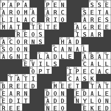 ACROSS 1. Dad 5. Fenced enclosure 8. Compass dir. 11. Scent 13. Curve 14. Stalk of a moss capsule 15. Pale purple color 16. River (Sp.) 17. Ancient Greek god of war 18. Floor covering 19. False hair 21. Match 22. Vintage cars 24. Austrian river, tributary to the Danube 25. Oak nuts 27. Possessed 29. Within a short period 30. Lessep's creation 32. Hindu god of fire 33. Dipping utensil 35. Blind as ____ 39. Vices 41. Give a ring to 42. Elect 43. Medicinal drug used to evoke vomiting 45. Jacques of French films 48. Keg 49. A special lineage 50. Rendezvous 52. Make lace 55. Merit 56. Spanish title 57. Peak District village in England 59. Prepare for publication 60. Find the sum of 61. High-strength synthetic material 62. To riddle 63. Modern: prefix 64. Made supply last DOWN 1. Inside of hand 2. Roberta Peters solo 3. Characterized by complete cowardliness 4. Nursemaid (var.) 5. Piece 6. 4th largest of the Great Lakes 7. Non-commissioned officer (abbr.) 8. Father Junipero _ 9. Bull 10. Comfort 12. 13-14th century defensive garment 14. Settles 20. Double-curved letter 21. Opera by Verdi 23. Bert's buddy 25. White ___ sheet 26. Gear tooth 27. Actor Linden 28. A saturated hydrocarbon 30. Music discs 31. Shoestrings 33. Mouth edge 34. The first octave above the treble staff 36. Sass 37. Wing 38. Affectionate concern, for short 40. Nothingness 43. Frozen water 44. Eucharist need 45. Swap 46. Nest on high 47. Portable shelter 49. Fermented drink made from hops 50. Method 51. Inside; within (prefix) 53. _ vera 54. Look after 56. One of the 12 tribes of Israel 58. Color