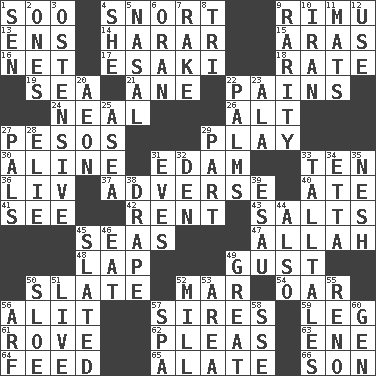 ACROSS 1. "Barney Miller" actor Jack 4. Derisive sound 9. Tall New Zealand timber tree 13. Followers of ems 14. Ethiopian city, capital of Harari 15. Ancient river in northeast Turkey 16. Fish or hair follower 17. 1973 Nobel Price Winner (Physics) Leo 18. Assign a rank or rating to 19. Ocean 21. A saturated hydrocarbon 22. Aches 24. Anneal 26. Keyboard modifier key 27. Mexican monetary units 29. Frolic 30. Place in a line 31. Dutch treat 33. Nine, plus one 36. 54 in ancient Rome 37. Contrary to your interests or welfare 40. Had dinner 41. Perceive with the eye 42. Monthly bill 43. Table seasonings 45. Oceans 47. Assad's deity 48. Infant locale 49. Abrupt rush of wind 50. Schedule 52. Spoil 54. Boat paddle 56. Set down 57. Male parents of animals 59. Part of a journey 61. Be footloose 62. Entreaties 63. Compass dir. 64. Nourish 65. Having winglike extensions 66. Manchild DOWN 1. Elected rep. 2. Washington bills 3. Clearly or manifestly demonstrative 4. A female animal or person 5. Rhinal 6. Northwest Algerian city 7. Libertine 8. Three (prefix) 9. Noteworthy scarcity 10. SW Asia republic 11. Floor protectors 12. Purpose 20. A really long time 22. Insides of hands 23. Insect wing 25. Toward the sea 27. Friends 28. Writer Wiesel 29. Piece 31. Nights before holidays 32. Lair 33. Baron Munchausen's specialties 34. Singer James 35. Tender 38. Window treatment 39. Son of Isaac 44. In addition 45. Scheduled 46. Erode 49. Relatively large 50. A type of plum 51. Moving, as bait 52. Place where flour is made 53. Length times width 55. Former U.S. Attorney General Janet 56. Sandy's bark 57. Health resort 58. Compass dir. 60. Commissioned mil. rank