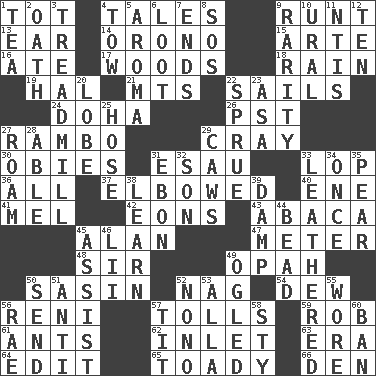 ACROSS 1. Small child 4. Stories 9. Undersized animal 13. Hearing organ 14. U. of Maine site 15. Johnson of "Laugh-In" 16. Had dinner 17. Forest 18. Precipitation 19. Actor Linden 21. Mountains (abbr.) 22. Moves on water 24. Capital of the state of Qatar 26. Pacific Standard Time (abbr.) 27. Role for Stallone 29. Supercomputer manufacturer 30. Off-Broadway awards 31. Son of Isaac 33. Chop off 36. 100% 37. Turned at an angle; bent 40. Compass dir. 41. Cartoonist voice _ Blanc 42. Immeasurably long periods of time 43. Phillipine bananalike plant 45. ____ Jay Lerner 47. Distance measurement 48. Title for a knight 49. Brightly colored fish 50. Indian antelope 52. Tired old horse 54. Morning condensation 56. Painter Guido (1575-1642) 57. For Whom the Bell _____ 59. Director Reiner 61. Pismires 62. An arm off of a larger body of water 63. Epoch 64. Prepare for publication 65. Sycophant 66. Lair DOWN 1. Afternoon social gathering 2. Pledge 3. Excercise machine 4. Pull behind 5. Scent 6. Spoils 7. Extremities 8. Mayday 9. Noteworthy scarcity 10. Mountain range 11. Nuclear Threat Initiatives 12. "___ Little Indians" 20. Ear part 22. Disorder 23. White ___ sheet 25. Stockings 27. Wander 28. Competent 29. Crow sounds 31. Inky black, to poets 32. Male child 33. Resembling or made to resemble leather 34. Single time 35. Lightbulb-shaped fruit 38. Acquire or gain knowledge or skills 39. Moist 44. Necklace unit 45. Help 46. Cards in a Roman deck? 49. Stared 50. Transmit 51. Against 52. Words to Nanette 53. Silent film actress Nazimova 55. Had on 56. Actress Charlotte 57. Teat (slang) 58. Filthy place 60. Forbid