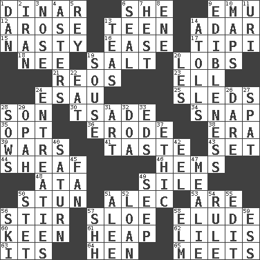 ACROSS 1. Middle Eastern gold or silver currency 6. A female animal or person 9. Australian flightless bird 12. Came up 13. Adolescent 14. The sixth month of the Jewish calendar 15. Smutty 16. Relaxation 17. Native american tent (variation) 18. Born 19. Table seasoning 20. Tennis shots 21. Vintage cars 23. Pipe bend 24. He sold his birthright 25. Bobsleighs 28. Male offspring 30. Sadhe (variant) 34. Fastener 35. Elect 36. Wear away 38. Epoch 39. Armed conflicts 41. Clothes sense 43. Put into a specified state 44. Archer's quiver 46. Folds over and sews together 48. _ moment's notice (2 wds.) 49. Filth; sediment 50. Make senseless or dizzy 51. Actor Baldwin 53. "We ___ not amused" (Victoria) 56. Tumult 57. _ gin 58. Dodge 60. Peachy ____! 61. Pile 62. Ms. Damita and namesakes 63. ___ a Wonderful Life 64. Layer 65. Confronts DOWN 1. Daniel's nick name 2. SW Asia republic 3. Sense of smell 4. Michaelmas daisies 5. Marina Del _, California 6. Lick closed 7. Behest 8. Compass dir. 9. The property of being fit to eat 10. Atlas contents 11. RI univ. 13. Afternoon social gatherings 14. Ringlike coral islands and reefs 19. Lush 20. French article 22. Erode 24. Pleas 26. Have the gumption 27. Petty quarrel 28. Sty mamas 29. Brightly colored fish 31. Nonscientific branch of learning 32. ___ good deed 33. Begley and Asner 37. Moral principle 40. Titan orbits this 42. Snakelike fish 45. Air blower 47. Ear of corn 49. Ooze 50. Proofreading order 51. Toward shelter 52. Grant temporary use of 54. Court order 55. Prepare for publication 56. What Jean-Claude Killy likes to do 57. Quiet! 58. Shade tree 59. Curvy letter