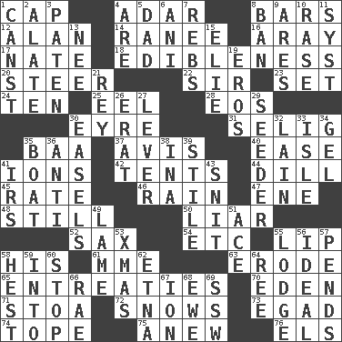 ACROSS 1. Head covering 4. The sixth month of the Jewish calendar 8. Drinking establishments 12. ____ Jay Lerner 14. The wife of a rajah (variant) 16. Like ___ of sunshine 17. Nathan's nickname 18. The property of being fit to eat 20. Navigate 22. Title for a knight 23. Arrange properly for use 24. Nine, plus one 25. Snakelike fish 28. Greek goddess of the dawn 30. Jane of fiction 31. Former Milwaukee Brewers owner Bud 35. Sound made by sheep 37. Deliberation 40. Comfort 41. Charged particles 42. Portable shelters 44. Deli pickle 45. Pace 46. Water falling in drops from the sky 47. Compass dir. 48. Free of sound 50. One who doesn't tell the truth 52. Saxophone 54. And so on (abbr.) 55. Mouth edge 58. Part of HMS, perhaps 61. Madame (abbr.) 63. Wear away 65. Pleas 70. Genesis locale 71. Portico 72. Frozen precipitation (plural) 73. Mild oath 74. Drink excessively 75. Afresh 76. Raised railways DOWN 1. 2nd pers. sing. pres. of can (arch.) 2. Having winglike extensions 3. Eucharist need 4. "We ___ not amused" (Victoria) 5. June honoree 6. Cuckoo 7. Confederate soldiers (slang) 8. Prohibit 9. Ancient Greek god of war 10. To erase 11. System (abbr.) 13. Born 15. Writer Wiesel 19. Greek god of love 21. Marina Del _, California 26. Part of Q.E.F. 27. Crowbar 29. Sowing specialist 30. Artist's stands 32. (Had) reclined 33. Small island 34. Set 35. Water vessel 36. Against 38. _ tizzy (2 wds.) 39. Vertical member of a panel or frame 41. Big collection agency 43. In a ____ (agitated or irritated) 49. Unable to walk 51. Adept person 53. Dec. holiday 55. Inn 56. Perfect 57. Depends 58. Behest 59. To the inside or interior of 60. Discontinue 62. Inactive volcano in Sicily 64. To separate or throw off 66. Actress Charlotte 67. Electrically charged atom 68. She-sheep 69. Compass dir.