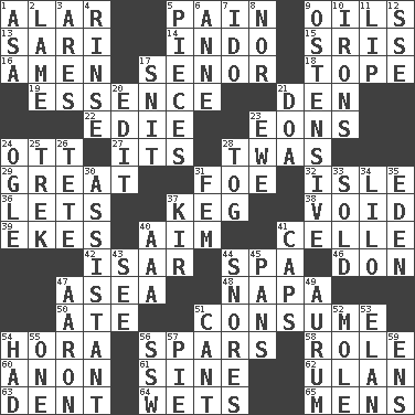 ACROSS 1. Having or resembling wings 5. Ache 9. Lubricates 13. Indian skirt 14. _ china 15. Indian titles of respect 16. So be it 17. Sir (Sp.) 18. Drink excessively 19. Gist 21. Lair 22. Singer Brickell 23. Immeasurably long periods of time 24. Baseball player Mel 27. It is 28. It was, poetically 29. Relatively large 31. Enemy 32. Small island 36. Allows 37. Barrel 38. State of nonexistence 39. Makes supply last 40. Direct toward a target or goal 41. Cell (Danish) 42. Austrian river, tributary to the Danube 44. Health resort 46. Spanish title 47. Toward the sea 48. California wine valley 50. Had dinner 51. Ingest 54. Israeli folk dance 56. Practice fights 58. Hero or heavy, e.g. 60. At once, immediately (arch.) 61. Trig term 62. ____ Bator 63. Gouge 64. Moistens 65. Not women's DOWN 1. White ___ sheet 2. Unable to walk 3. Ancient Greek god of war 4. Remove soap 5. Parts 6. Singer Murray 7. Wedding promise 8. And not 9. Clearly or manifestly demonstrative 10. Removes the wrinkles 11. Mouth edge 12. Compass dir. 17. In a ____ (agitated or irritated) 20. Prepare for publication 21. ___ good deed 23. She-sheep 24. Stare at amorously 25. Long journey 26. Wig 28. Coat; cloak 30. Helper 31. Opposite of masc. 33. Exchanged or delivered for money 34. _ and Stitch 35. Genesis locale 37. Apertif with cassis 40. Auto club (abbr.) 41. Smile enhancers 43. Perceive with the eye 44. Sounds asleep 45. Baking dishes 47. Composer Copland 49. Gold (Symbol: Au) 51. Patter 52. Undercover agent 53. Liveliness 54. Possessed 55. Single 56. Compass dir. 57. Sliced dessert 59. Followers of ems