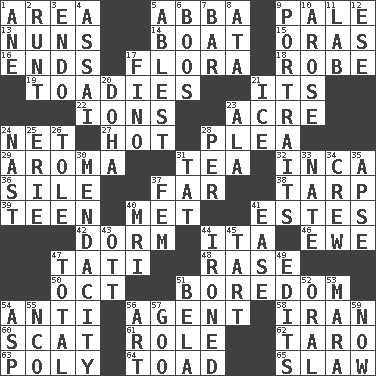 ACROSS 1. Type of rug 5. Swedish rock group 9. Light colored 13. Religious women 14. Water vessel 15. Mouths or openings 16. Extremities 17. Plants 18. Loose flowing garment 19. Sycophants 21. ___ a Wonderful Life 22. Charged atoms 23. 43,560 square feet 24. Fish or hair follower 27. Being at a high temperature 28. Entreaty 29. Scent 31. Afternoon social gathering 32. South American Indian 36. Filth; sediment 37. At a great distance 38. Canvas cover 39. Adolescent 40. Was introduced to 41. _____ Park, CO 42. Dormintory (informal) 44. Call ___ day 46. She-sheep 47. Jacques of French films 48. Raze (variant) 50. Sep. follower 51. Mood resulting from idleness 54. Opposed to 56. Representative 58. SW Asia republic 60. Jazz singing style 61. Hero or heavy, e.g. 62. Pacific island yam 63. More than one (prefix) 64. Frog relative 65. Cole _ (cabbage dish) DOWN 1. A saturated hydrocarbon 2. The smallest animal of a litter 3. Inside; within (prefix) 4. Slender Brazilian palm 5. Most capable 6. Scornful sounds 7. Drinking establishment 8. _ moment's notice (2 wds.) 9. Likenesses of persons 10. Came up 11. Experiment locale 12. Compass dir. 17. Fine (Spanish) 20. Capital of the state of Qatar 21. Frozen water 23. Insect wing 24. Political cartoonist Thomas 25. 4th largest of the Great Lakes 26. Lacquered or enameled metalware 28. For each 30. Ananias' fault 31. Make lace 33. Nathan's nickname 34. Ship's personnel 35. Domed church section 37. Opposite of masc. 40. Medical imaging device (abbr.) 41. Comfort 43. Baseball player Mel 44. Pressed 45. Small pie 47. "_____ Recall" 49. Prepares for publication 51. Actor Lugosi 52. Relating to the mouth 53. Hindu Mythology: god of death 54. Viper 55. Non-commissioned officer (abbr.) 56. Nonscientific branch of learning 57. Thick or sticky substance 59. At this time