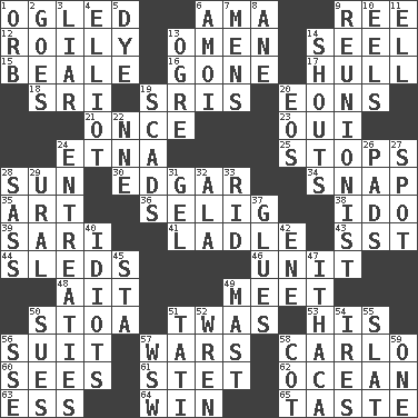 ACROSS 1. Stared at amorously 6. Nanny (var.) 9. To separate or throw off 12. Agitated, as a liquid 13. Sign of things to come 14. Stitch closed the eyes of (a falcon) 15. Memphis, Tenn. Street 16. Went 17. Frame or body of a ship 18. Indian title of respect (Mr.) 19. Indian titles of respect 20. Immeasurably long periods of time 21. Single time 23. Fr. "Yes" 24. Inactive volcano in Sicily 25. Obstructs or blocks passage 28. Player for Phoenix 30. _ Allan Poe 34. Fastener 35. Tate display 36. Former Milwaukee Brewers owner Bud 38. Wedding promise 39. Indian skirt 41. Dipping utensil 43. Fast jet (abbr.) 44. Bobsleighs 46. A single undivided whole 48. Small island 49. Rendezvous 50. Portico 51. It was, poetically 53. Part of HMS, perhaps 56. Set of matching outer garments 57. Armed conflicts 58. Monte _, Las Vegas Hotel/Casino 60. Perceives with the eye 61. Proofreading order 62. Sea 63. Double-curved letter 64. Victory 65. Clothes sense DOWN 1. Globe 2. Moves 3. One who doesn't tell the truth 4. American author Paul (1891-1958) 5. Color 6. Mine, in Marseilles 7. Not women's 8. One (Scot) 9. One who advocates reunion 10. Snakelike fish 11. Pipe bend 13. Legendary monster 14. Yells 19. Loads 20. Greek goddess of the dawn 22. Compass dir. 24. Pleas 26. Groovy apts. 27. Blemish 28. Backtalk 29. Mountain range 31. Set 32. Wing 33. To free from 37. Adhesives 40. Foolish or stupid persons 42. Compass dir. 45. R.R. building 47. New York city 49. Vertical spar for supporting sails 50. Takes to court 51. Jacques of French films 52. Songbird 54. Angers 55. Narrow board 56. Compass dir. 57. Compass dir. 58. Small bed 59. Single
