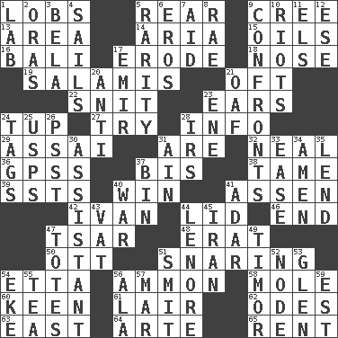 ACROSS 1. Tennis shots 5. Stern 9. Algonquian 13. Type of rug 14. Operatic vocal solo 15. Lubricates 16. Indonesian resort city 17. Wear away 18. Characteristic smell of wine 19. Deli grouping 21. Often (poetically) 22. In a ____ (agitated or irritated) 23. Hearing organs 24. Uncastrated adult male sheep 27. Attempt to accomplish something 28. Information 29. Slender Brazilian palm 31. "We ___ not amused" (Victoria) 32. Be tempered by heat 36. Global Positioning Systems (abbr.) 37. Altar cloth linen 38. Docile 39. Fast planes 40. Victory 41. NE Netherlands city 42. "Terrible" tsar 44. Hat (slang) 46. Conclude 47. Russian ruler of old 48. Part of Q.E.F. 50. Baseball player Mel 51. Catching in a trap 54. Singer James 56. ID or VA city 58. Undercover agent 60. Peachy ____! 61. Den 62. Lyric poems 63. 90 degrees 64. Johnson of "Laugh-In" 65. Monthly bill DOWN 1. Experiment locale 2. Mouths or openings 3. Actor Lugosi 4. Moves on water 5. Noteworthy scarcity 6. Greek god of love 7. Help 8. Actress Charlotte 9. Meets 10. Debaucheries 11. Raised railways 12. Compass dir. 17. Arab leader 20. Opposed to 21. Clumsy lout 23. Compass dir. 24. Labels 25. United States Postal Service (abbr.) 26. Inconspicuous attention getter 28. Big collection agency 30. Aide 31. The 18th letter of the Arabic alphabet 33. Comfort 34. So be it 35. Grant temporary use of 37. Storage container 40. Armed conflict 41. The sixth month of the Jewish calendar 43. Large container 44. Poe poem 45. SW Asia republic 47. Lugs 49. The easternmost of the Lesser Sundas 51. Stricken, poetically 52. Thickened enlargement 53. Small, secluded valley 54. Supplement with great effort 55. Afternoon social gathering 56. In the manner of 57. Spoil 59. Eastern Standard Time (abbr.)
