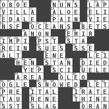 ACROSS 1. Mitch Miller's instrument 5. Religious women 9. Pet locale 12. Country estate 14. _ vera 15. Connecticut Ivy Leaguer 16. Peak District village in England 17. Ache 18. Compete 19. Overdraft (abbr.) 20. Seas 23. Stakes 24. At once, immediately (arch.) 25. Arab leader 27. Body of Kaffir warriors 30. Pacific Standard Time (abbr.) 32. R.R. building 33. It's straight from the horse's mouth 34. Institutes legal proceedings 36. Compass dir. 38. The first octave above the treble staff 39. Compass dir. 40. Luau accessory 43. Layer 46. Comedian Laurel of Laurel & Hardy 48. Passed on 49. Slangy assent 51. _-fi 52. Ubangi River tributary 53. Type of rug 54. Margarine 56. Stare at amorously 58. Overwhelmed 61. Allow 64. Before (prefix) 65. Slanted text style (abbr.) 66. Feeling or showing extreme anger 68. The 19th letter of the Greek alphabet 69. French philosopher Descartes 70. One or ones belonging to thee 71. Fast jet (abbr.) 72. Volcanic refuse 73. Northwest Algerian city DOWN 1. Baking chamber 2. Auction offers 3. Norwegian king 4. Pipe bend 5. California wine valley 6. ____ Bator 7. Annoying sounds 8. Elected rep. 9. Crowbar 10. Set down 11. Sliced desserts 13. Period of immesurable duration 21. 911 reaches them 22. Follows as a consequence or result 23. Prejudice 24. The 18th letter of the Arabic alphabet 26. Mountains (abbr.) 27. Retirement account (abbr.) 28. Cartoonist voice _ Blanc 29. Heart or essence 31. Portable shelters 35. Manatee 37. Writer Wiesel 41. Snakelike fish 42. Binary compound 44. Jane of fiction 45. Born 47. Mediterranean tributary 48. Superhero pair 50. Soft color 53. Native American of Southwest Alaska 55. Prepare for publication 56. Elects 57. Pate de foie ____ 59. Nanny 60. Cassini of fashion 61. Den 62. Inactive volcano in Sicily 63. Adolescent 65. Big collection agency 67. 17th letter of the Greek alphabet