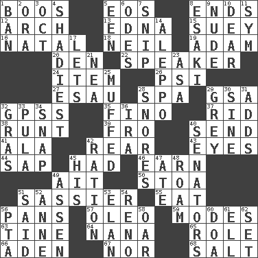ACROSS 1. Scornful sounds 5. Greek goddess of the dawn 8. Conclusions 12. Bowlike part 13. Pulitzer Prize-winning author Ferber 15. Chop _ 16. Brizilian seaport 18. Famous astronaut Armstrong 19. First of billions? 20. Lair 22. Orator 24. A distinct part 26. Air pressure measure (abbr.) 27. He sold his birthright 28. Health resort 29. Girls' org. (abbr.) 32. Global Positioning Systems (abbr.) 35. A pale, very dry sherry 37. To free from 38. The smallest animal of a litter 39. Away 40. Post 41. In the manner of 42. Tail end 43. Sight organs 44. Plant excrement 45. Possessed 46. Merit 49. Small island 50. Portico 51. More impudent 55. Consume 56. Baking dishes 57. Butter sub 59. Methods 63. Prong on a fork 64. Nanny 65. Hero or heavy, e.g. 66. An important port of Yemen 67. Or not 68. Table seasoning DOWN 1. Prohibit 2. Mouth or opening 3. Sep. follower 4. Most questionable 5. Car or cant ending 6. Lyric poems 7. Clip 8. 1973 Nobel Price Winner (Physics) Leo 9. Unadorned 10. Letter starter 11. Symbol (abbr.) 14. City in Syria 17. Allows 21. Teachers' org. 23. White ___ sheet 25. Performed or handled clumsily 28. Sounds asleep 29. Jennifer or Joel 30. Trig term 31. Sums up 32. Pate de foie ____ 33. Monetary unit of Botswana 34. Fastener 36. Retirement account (abbr.) 40. Elected representatives 42. Food allowance for one day 45. Part of HMS, perhaps 47. Had dinner 48. Wander aimlessly 49. NE Netherlands city 51. Alleged 52. Queen of England 1702-14 53. Liveliness 54. Former U.S. Attorney General Janet 56. Parent Teacher Assoc. 58. Rowing implement 60. ___ good deed 61. Pipe bend 62. Arrange properly for use