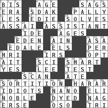 ACROSS 1. Again 4. Mature 7. Droops 11. Epoch 12. Neighbor of Neb. 13. Chummy 14. French article 15. Singer Brickell 16. Finds the solution 17. Slender Brazilian palm 19. Helper 21. Binary compound 23. Ripens 24. Locale of original sin 25. The 18th letter of the Arabic alphabet 26. White ___ sheet 29. Peak District village in England 30. Raised railways 31. For each 32. Medical imaging device (abbr.) 33. Big collection agency 34. Choose 35. Small island 36. _-fi 37. Don Adams' spy role 40. Affirmative reply 41. Area sheltered from the wind 42. Trial 43. Skim 45. Had dinner 46. Conclusion 51. Ethiopian city, capital of Harari 55. Foolish or stupid persons 56. Billionth: prefix 58. Connecticut Ivy Leaguer 59. Having high moral qualities 60. Colored 61. Tired old horse 62. Celtic language 63. Bear (Spanish) 64. Three (prefix) DOWN 1. Actor Lugosi 2. Angers 3. Backtalk 4. Find the sum of 5. Greek goddess of the earth (variant) 6. Supplements with great effort 7. Table seasonings 8. Inventor's middle name 9. Small, secluded valley 10. System (abbr.) 12. Beer mug 13. Airs 16. Public displays of written messages 18. Opera by Verdi 20. Moves on water 22. Compass dir. 24. Proofreads 25. Nest on high 26. To the left, to Queeg 27. Back-to-school mo. 28. Tate display 29. 4th largest of the Great Lakes 32. Fifth month 33. Ancient Celtic tribe of eastern Britain 36. Narrow boards 37. R.R. building 38. Mode 39. At sea 43. Fur scarf 44. Quote 46. Trig term 47. Aroma 48. Chest bones 49. Southwest Nigerian state 50. Negative votes 52. Monthly bill 53. Having or resembling wings 54. Swiss mountan, "Queen of the Mountains" 57. Modern: prefix