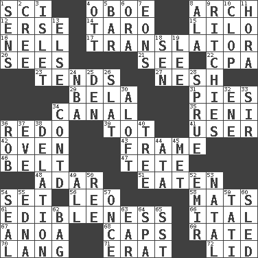 ACROSS 1. _-fi 4. Mitch Miller's instrument 8. Bowlike part 12. Celtic language 14. Pacific island yam 15. _ and Stitch 16. 1994 drama film starring Jodie Foster 17. Interpreter 20. Observes 21. Observe 22. Numbers guy (abbr.) 23. Is inclined (to) 27. Tender 29. Actor Lugosi 31. Sliced desserts 34. Lessep's creation 35. Painter Guido (1575-1642) 36. Do over again 39. Small child 41. One who makes use of a thing 42. Baking chamber 43. Movie unit 46. Waist strap 47. False hair 48. The sixth month of the Jewish calendar 51. Eroded 54. Arrange properly for use 56. Lion 58. Floor protectors 61. The property of being fit to eat 66. Slanted text style (abbr.) 67. Small Philippine buffalo 68. Smile enhancers 69. Assign a rank or rating to 70. Austrian-born American filmmaker Fritz 71. Part of Q.E.F. 72. Flaplike covering DOWN 1. Elected reps. 2. Algonquian 3. Small island 4. Baseball player Mel 5. Oblong piece of solid material 6. Mouth or opening 7. Immeasurably long periods of time 8. Wing 9. Actors Guy, Robert Welles, and Clint 10. Hoof sound 11. Israeli folk dance 13. Otherwise 18. Elected rep. 19. Area sheltered from the wind 24. Basketball assoc. 25. Lair 26. Narrow board 28. Disorder 30. High up in or into the air 32. Compass dir. 33. Title for a knight 34. Continued (abbr.) 36. Director Reiner 37. Night before a holiday 38. Accusation by an informer 40. Relationship diagram 44. "One Day ___ Time" 45. Was introduced to 49. Everything 50. To sift 52. Independent ruler or chieftain 53. Relating to or accompanying birth 54. Lick closed 55. Pulitzer Prize-winning author Ferber 57. Single time 59. Jacques of French films 60. Downhill vehicle 62. Paper or plastic container 63. Ewer handle 64. Health resort 65. Fast jet (abbr.)