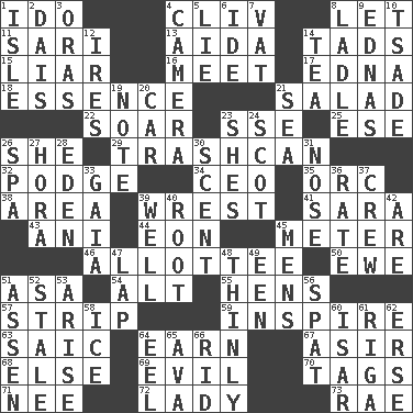 ACROSS 1. Wedding promise 4. 154 in Roman numerals 8. Allow 11. Indian skirt 13. Opera by Verdi 14. Bits 15. One who doesn't tell the truth 16. Confront 17. Pulitzer Prize-winning author Ferber 18. Center 21. First course 22. Fly high 23. Compass dir. 25. Compass dir. 26. A female animal or person 29. File 13 32. Porridge 34. Corporate head (abbr.) 35. The grampus (Milton) 38. Length times width 39. Obtain by seizing forcibly or violently 41. "Two Mules for Sister ____" 43. Cuckoo 44. Age 45. Distance measurement 46. One to whom something is allotted 50. She-sheep 51. White ___ sheet 54. The first octave above the treble staff 55. Coop moms 57. Remove all contents or possession from 59. Stimulate to action 63. Ketch in the Levant 64. Merit 67. SW Saudi Arabia district 68. Otherwise 69. Morally bad or wrong 70. Labels 71. Born 72. Kenny Rogers chart-topper in '80 73. Actress Charlotte DOWN 1. Capri or Wright 2. Raised platform 3. Mouths or openings 4. Device for capturing images 5. Falsehood 6. Binary compound 7. Large container 8. Dipping utensil 9. Ferber et al. 10. Sadhe (variant) 12. Angers 14. Beverage made from leaves 19. Short letter 20. 4-wheeled motor vehicle 21. Ocean 23. "______ My Girl" (Turtles hit) 24. Highlander 26. Health resort 27. Israeli folk dance 28. Paradise 30. Odor 31. Sense of smell 33. Greek goddess of the earth (variant) 36. Pace 37. Group working together 39. Not ill 40. Carrot, for example 42. "We ___ not amused" (Victoria) 45. Not women's 47. Pet locale 48. Without viscosity 49. Car or cant ending 51. NE Netherlands city 52. Lacking originality or spontaneity 53. Originate 56. Petty quarrel 58. Frozen water 60. Austrian river, tributary to the Danube 61. Port city in Latvia 62. Celtic language 64. Snakelike fish 65. Actress Gardner 66. To free from