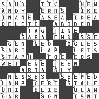 ACROSS 1. Saudi Arabian king (1953-1964) 5. Nervous spasm 8. Layer 11. Actor Griffith 12. Blunders 14. Mamie's mate 15. Silly 17. Toward the sea 18. The content of cognition 19. Erase 21. Tolerated 23. Label 25. Prong on a fork 26. "Two Mules for Sister ____" 27. Conclude 28. Compass dir. 31. Commissioned mil. rank 33. Modern: prefix 35. Stares at amorously 37. Indian skirt 38. Pet locale 40. Allows 41. Staphylococcus 43. Enemy 45. Begley and Asner 46. Dripping 47. Compass dir. 50. Adolescent 52. Roberta Peters solo 53. Secret 54. Makes clutter 56. Oozed 61. Desk light 62. Certainty 65. Having lost freshness 66. RI univ. 67. Writer Wiesel 68. ____ Bator 69. Rowing implement 70. Male child 71. Is not DOWN 1. Alleged 2. Queen of England 1702-14 3. Freehold land 4. Unit of force 5. Beverage made from leaves 6. Big collection agency 7. Make 8. Flintstone garb 9. Made supply last 10. Teachers' org. 13. Unit of acoustic absorption 16. Singer James 18. Binary compound 20. Merit 22. _ china 24. Highlander 26. Clip 28. Downhill vehicle 29. Puts into a specified state 30. Curvy letter 31. Yard entry 32. Part of Q.E.F. 34. Clumsy lout 36. Small, secluded valley 37. Compass dir. 39. Cooking vessels 42. Possessive pronoun 44. Snakelike fish 48. Sibling's daughter 49. Artist's stands 51. Snake ____ (dice throw) 52. Viper 54. Hindu Mythology: god of death 55. Arab leader 57. Needle holder 58. Friends 59. Style 60. Scratch 61. Nilotic language 63. _ de Janeiro 64. Nine, plus one