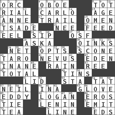 ACROSS 1. The grampus (Milton) 4. Mitch Miller's instrument 8. Small child 11. Monetary unit of Yemen 13. Monte _, Las Vegas Hotel/Casino 15. Personal question 16. Queen of England 1702-14 17. Hang back 18. Sign of things to come 19. Sadhe (variant) 21. Born 22. Nourish 23. Snakelike fish 24. Small drink 27. Order of Saint Francis (abbr.) 29. "____ silly question..." 30. Pig sounds 34. Fish or hair follower 36. Chooses 39. Biscuitlike quick bread 40. Pacific island yam 41. Mole, birthmark 43. Locale of original sin 44. Silly 46. Precipitation 47. To riddle 48. "_____ Recall" 49. Airtight sealed metal containers 51. Hat (slang) 53. R.R. building 54. Make lace 57. Famous astronaut Armstrong 60. _ tizzy (2 wds.) 63. Michael Jackson trademark 65. Whirlpool 66. Utah city north of Ogden 69. Greek god of love 70. Standoff 71. Soviet premier 1918-24 72. Send forth 73. Afternoon social gathering 74. Actor's bit 75. Begley and Asner DOWN 1. Declaim 2. Remove soap 3. Lessep's creation 4. Sep. follower 5. Drinking establishment 6. Northwest Algerian city 7. Writer Wiesel 8. Docile 9. Double curve, resembling the letter S 10. Look after 12. Directed 14. Margarine 18. Persons of authority 20. Double-curved letter 25. Image 26. Some stationery 28. Distress signal 29. Lacking a tonal center or key 31. Connecting point 32. Leg joint 33. Elected rep. 34. Billionth: prefix 35. Part of Q.E.F. 37. Federal power corp. 38. Sets of matching outer garments 40. Teat (slang) 42. In a ____ (agitated or irritated) 45. Connecticut Ivy Leaguer 50. Tired old horse 52. Deli pickle 54. Singer Mel 55. Keep away from 56. Trials 57. Remaining after all deductions 58. Singer Brickell 59. The main thing one is thinking about 61. Christmas carol 62. Hindu god of fire 64. Area sheltered from the wind 67. The 18th letter of the Arabic alphabet 68. Compass dir.