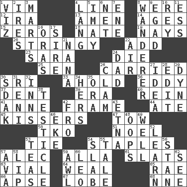 ACROSS 1. Zeal 4. Actor's bit 8. We are 12. Retirement account (abbr.) 13. So be it 14. Eras 15. Nothings 18. Nathan's nickname 19. Negative votes 20. Slender, wiry 22. Say or write further 23. "Two Mules for Sister ____" 24. Pass on 25. Elected rep. 26. Borne 30. _ Lanka 33. Hold, grip (Informal) 36. Whirlpool 37. Gouge 39. Period 40. It's straight from the horse's mouth 41. Singer Murray 42. Movie unit 44. Had dinner 45. Smoochers 47. Pull behind 50. Ring climax 51. Christmas carol 53. Make a knot 54. Paper fasteners 57. Actor Baldwin 59. Silent film actress Nazimova 61. Narrow boards 63. Small bottle 64. Welt 65. Actress Charlotte 66. Domed church section 67. Ear part 68. Compass dir. DOWN 1. To wit 2. Angers 3. Shops 4. Austrian-born American filmmaker Fritz 5. "If ____ say so..." 6. Fish or hair follower 7. Compass dir. 8. Nomad 9. Mild oath 10. Marina Del _, California 11. Double-curved letter 16. Mouths or openings 17. The founder of a family 21. Grandmother 22. Wind 24. Male parent 26. Dollar (slang) 27. It may be bright or harebrained 28. Prepare for publication 29. Centimeter-gram-second unit of force 30. Neighbor of Neb. 31. Painter Guido (1575-1642) 32. Taverns 34. Possessive pronoun 35. Mouth or opening 38. One of the two male reproductive glands 42. From 43. Inactive volcano in Sicily 46. Supplement with great effort 48. I made a mistake 49. Water source 52. Acquire or gain knowledge or skills 53. Afternoon social gatherings 54. Broad, flat, thick piece 55. Falsehood 56. Comedian Laurel of Laurel & Hardy 57. Actress Gardner 58. Mouth edge 59. Leather borer 60. Lion 62. Perceive with the eye