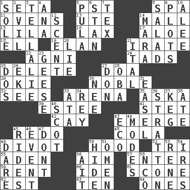 ACROSS 1. Bristle 5. Pacific Standard Time (abbr.) 8. Health resort 11. Baking chambers 13. Shoshoni 14. Promenade 15. Pale purple color 16. Not strict 17. Medicinal plant 18. Pipe bend 19. Enthusiasm 21. Feeling or showing extreme anger 22. Hindu god of fire 24. Small boys 25. Keyboard key 27. ___ good deed 29. Migrant worker of the '30s 30. Having high moral qualities 32. Perceives with the eye 33. Sports stadium 35. "____ silly question..." 39. First name in cosmetics 41. Proofreading order 42. Island 43. Develop 45. Redecorate 48. Root beer relative 49. A piece of turf (Scot.) 50. Parka part 52. Three (prefix) 55. Arabian gulf 56. Direct toward a target or goal 57. Keyboard key 59. Monthly bill 60. Binary compound 61. Biscuitlike quick bread 62. Eastern Standard Time (abbr.) 63. Nine, plus one 64. Washington bills DOWN 1. Not divided or shared with others 2. Morally bad or wrong 3. Copy Pinocchio 4. Santa ___, CA 5. Monetary unit of Botswana 6. Comedian Laurel of Laurel & Hardy 7. John Ritter's dad 8. Vegetable dish 9. Schemes 10. Toward shelter 12. Odor 14. Hindu Mythology: god of death 20. Falsehood 21. Slanted text style (abbr.) 23. Honkers 25. Two (Sp.) 26. Make supply last 27. Spanish title 28. Chief or king in Benin or Nigeria 30. Born 31. Artist's stand 33. _ moment's notice (2 wds.) 34. Marina Del _, California 36. Ski resort town in Vermont 37. Barrel 38. Had dinner 40. Native of Scotland 43. Environmental prefix 44. Methods 45. Amusement-park features 46. Incident 47. Do not 49. Have the gumption 50. Flintstone garb 51. Sign of things to come 53. French philosopher Descartes 54. Angers 56. Small island 58. Non-commissioned officer (abbr.)