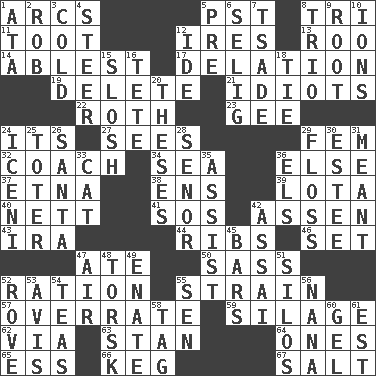 ACROSS 1. Arches 5. Pacific Standard Time (abbr.) 8. Three (prefix) 11. A blast of a horn 12. Angers 13. Friend of Pooh 14. Most capable 17. Accusation by an informer 19. Erase 21. Foolish or stupid persons 22. Writer of Portnoy's Complaint (1969) 23. Unit of force equal to gravity 24. ___ a Wonderful Life 27. Perceives with the eye 29. Opposite of masc. 32. Team commander 34. Ocean 36. Otherwise 37. Inactive volcano in Sicily 38. Followers of ems 39. Globular water bottle used in Asia 40. Remaining after all deductions 41. Mayday 42. NE Netherlands city 43. Lyricist Gershwin 44. Teases 46. Put into a specified state 47. Had dinner 50. Backtalk 52. Food allowance for one day 55. Put through a sieve 57. Make much ado about nothing 59. Fodder prepared in a silo 62. By way of 63. Comedian Laurel of Laurel & Hardy 64. Washington bills 65. Curvy letter 66. Barrel 67. Table seasoning DOWN 1. "One Day ___ Time" 2. Director Reiner 3. Having a low temperature 4. Guide 5. Before (prefix) 6. Major League Baseball Commissioner Bud 7. Sadhe (variant) 8. Musical group of three 9. Carrot, for example 10. Charged particles 12. Binary compound 15. Make a splashing sound 16. Wig 18. Standoff 20. College papers 24. Ancient Celtic tribe of eastern Britain 25. Carrier 26. Before Barbara or Clara 28. Sir (Sp.) 29. Soft thread for cleaning between teeth 30. First name in cosmetics 31. Intended 33. Feline 35. Aid 36. Raised railways 42. Slender Brazilian palm 45. Taverns 47. Atmosphere 48. Cod relative 49. Maternal 51. Grain storage towers 52. Be footloose 53. Deliberation 54. Afternoon social gatherings 55. Elected rep. 56. Grandmother 58. Label 60. Set 61. Eastern Standard Time (abbr.)