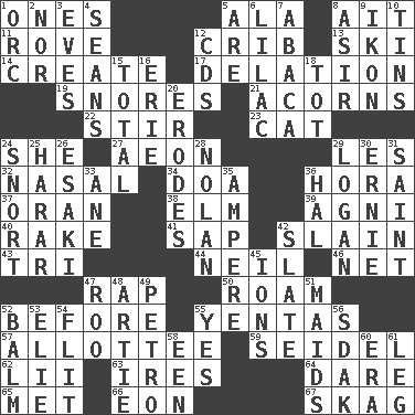 ACROSS 1. Washington bills 5. In the manner of 8. Small island 11. Be footloose 12. Baby bed with high sides 13. What Jean-Claude Killy likes to do 14. Cause to be 17. Accusation by an informer 19. Sounds asleep 21. Oak nuts 22. Use a spoon 23. Domesticated feline 24. A female animal or person 27. Period of immesurable duration 29. French article 32. Relating to the nose 34. ___ good deed 36. Israeli folk dance 37. NW Algerian seaport 38. Shade tree 39. Hindu god of fire 40. Libertine 41. Plant excrement 42. Killed 43. Three (prefix) 44. Famous astronaut Armstrong 46. Fish or hair follower 47. Hit sharply and swiftly 50. Wander aimlessly 52. Prior to 55. Gossips 57. One to whom something is allotted 59. Beer mug 62. Cards in a Roman deck? 63. Angers 64. Have the gumption 65. Was introduced to 66. Period of immesurable duration 67. Heroin DOWN 1. The grampus (Milton) 2. Or not 3. Nights before holidays 4. Actors Connery and Penn 5. "We ___ not amused" (Victoria) 6. Pale purple color 7. Phillipine bananalike plant 8. SW Saudi Arabia district 9. Visual representation of an object 10. Metal containers 12. Music discs 15. Add up to 16. 4th largest of the Great Lakes 18. Small child 20. Eats (away) 24. Derisive sound 25. Ethiopian city, capital of Harari 26. 1973 Nobel Price Winner (Physics) Leo 28. Pitcher Ryan 29. Utah city north of Ogden 30. Bert's buddy 31. Virtuous person 33. A saturated hydrocarbon 35. Electrical Unit 36. Actor Linden 42. Schedule 45. Charged atoms 47. Friend of Pooh 48. Nick name for Arthur 49. Stone: prefix 51. Unmarried girls 52. Lip ointment 53. Writer Wiesel 54. Sudden quick movement 55. Consenting reply 56. Neighbor of Neb. 58. Car or cant ending 60. Period 61. Part of a journey