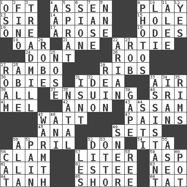 ACROSS 1. Often (poetically) 4. NE Netherlands city 9. Frolic 13. Title for a knight 14. Bee-related 15. Opening into or through something 16. Single 17. Came up 18. Lyric poems 19. Rowing implement 21. A saturated hydrocarbon 22. Nick name for Arthur 24. Do not 26. Friend of Pooh 27. Role for Stallone 29. Chest bones 30. Off-Broadway awards 31. The content of cognition 33. Atmosphere 36. 100% 37. Taking place subsequently 40. _ Lanka 41. Cartoonist voice _ Blanc 42. At once, immediately (arch.) 43. Indian state 45. Electrical Unit 47. Aches 48. Santa ___, CA 49. Puts into a specified state 50. Showery time 52. Spanish title 54. Call ___ day 56. Burrowing marine mollusk 57. 61 cubic inches 59. Viper 61. Set down 62. First name in cosmetics 63. Modern: prefix 64. Hyperbolic tangent 65. Dinah or Pauly 66. Make lace DOWN 1. Bear (Spanish) 2. A pale, very dry sherry 3. Excercise machine 4. Auto club (abbr.) 5. Small fatty European fish 6. The Jewish people; Israel 7. Relaxation 8. Compass dir. 9. Pictures 10. Farming town in central California 11. Toward shelter 12. It is so 20. Loose flowing garment 22. Believer in; advocate of (suffix) 23. Director Reiner 25. Characteristic smell of wine 27. Wander aimlessly 28. Competent 29. It's straight from the horse's mouth 31. Is not 32. Superhero pair 33. Helper 34. SW Asia republic 35. Basketball hoops 38. Relating to or accompanying birth 39. Open wide 44. Suttee (variant) 45. Heat 46. Cuckoo 49. Scornful expression 50. Silent film actress Nazimova 51. Ache 52. Food container 53. Von Bismarck 55. At sea 56. Domesticated feline 57. French article 58. To riddle 60. Plant holder