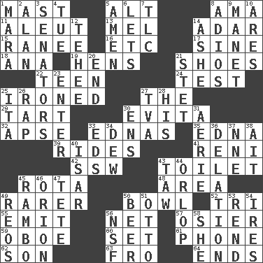 ACROSS 1. Vertical spar for supporting sails 5. Keyboard modifier key 8. Nanny (var.) 11. Eskimo relative 13. Cartoonist voice _ Blanc 14. The sixth month of the Jewish calendar 15. Indian princess (variant) 16. And so on (abbr.) 17. Trig term 18. Santa ___, CA 19. Coop moms 21. Imelda's hoard 22. Adolescent 24. Trial 25. Pressed 27. Definite Article 29. Small pie 30. Webber/Rice musical 32. Domed church section 33. Ferber et al. 35. Pulitzer Prize-winning author Ferber 39. Amusement-park features 41. Painter Guido (1575-1642) 42. Compass dir. 43. Rest room 45. Roll call or roster of names 48. Length times width 49. Less widely known 50. Soup holder 52. Three (prefix) 55. Give off 56. Fish or hair follower 57. Flexible twig of a willow tree 59. Mitch Miller's instrument 60. Arrange properly for use 61. Give a jingle 62. Boy, to dad 63. Away 64. Extremities DOWN 1. Hindu Mythology: god of death 2. Actor Alda or Thicke 3. Legislators 4. Third day of the wk. 5. So be it 6. Allows 7. Affectionate concern, for short 8. Goodbye (Sp.) 9. French painter Edouard 10. Ancient Greek god of war 12. Giggle 14. American tennis player Robert 20. Conclusion 21. Proofreading order 23. Keyboard key 25. Call ___ day 26. Strike 27. Federal power corp. 28. Part of HMS, perhaps 30. Followers of ems 31. Nest on high 33. Begley and Asner 34. Morning condensation 36. Conveyance 37. Compass dir. 38. Small island 40. Austrian river, tributary to the Danube 43. The 23rd letter of the Hebrew alphabet 44. Fourth or lowest deck 45. Role for Stallone 46. Greek mythologigal hunter 47. False hair 49. Vintage cars 50. Fermented drink made from hops 51. "Beetle Bailey" pooch 53. Tear apart 54. Angers 56. Science/research agcy. 58. A female animal or person
