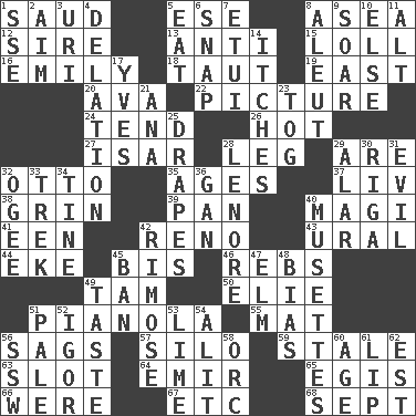 ACROSS 1. Saudi Arabian king (1953-1964) 5. Compass dir. 8. Toward the sea 12. Male parent of an animal 13. Against 15. Hang loosely or laxly 16. Poet Dickinson 18. Pulled tight 19. 90 degrees 20. Actress Gardner 22. Photo 24. Watch over 26. Being at a high temperature 27. Austrian river, tributary to the Danube 28. Part of a journey 29. "We ___ not amused" (Victoria) 32. Von Bismarck 35. Ripens 37. 54 in ancient Rome 38. Amused look 39. Baking dish 40. Wise men 41. Car or cant ending 42. Western Nevada city 43. Mountain range 44. Make supply last 45. Twice 46. Confederate soldiers (slang) 49. Scottish cap 50. Writer Wiesel 51. Player piano 55. Floor covering 56. Sinks 57. Grain storage tower 59. Having lost freshness 63. Narrow opening 64. Arab leader 65. Armor plate that protects the chest 66. Past tense of be (plural) 67. And so on (abbr.) 68. Back-to-school mo. DOWN 1. Compass dir. 2. Direct toward a target or goal 3. RI univ. 4. Conveyance 5. Ingest 6. Fastener 7. Needle holder 8. Native American of Southwest Alaska 9. Fly high 10. Otherwise 11. Keyboard modifier key 14. Strong, restless desires 17. Jacques Cousteau's middle name 21. Santa ___, CA 23. Coat; cloak 25. Window treatments 28. Poe poem 29. Having or resembling wings 30. Port city in Latvia 31. Tending to cause great harm 32. Double curve, resembling the letter S 33. Long journey 34. Prong on a fork 36. Separate the seeds from cotton 40. French bagpipes 42. Full of chinks, cracks, or crevices 45. Forbid 47. Shade tree 48. Prejudice 49. Clothes sense 51. Light colored 52. Composer Stravinsky 53. Welles in "The Third Man" 54. Set down 56. Compass dir. 58. The grampus (Milton) 60. Ripen 61. Mouth edge 62. Eastern Standard Time (abbr.)