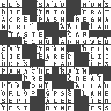 ACROSS 1. Raised railways 4. Alleged 8. Religious women 12. Expire 13. To the inside or interior of 14. Part of Q.E.F. 15. 43,560 square feet 17. Romantic infatuation 18. Rain (Swedish) 19. Haggard of country music 21. A saturated hydrocarbon 23. Hearing organ 24. Clothes sense 26. Boat paddle 28. Shade of tan 30. Moved like an arrow 34. Feline 37. SW Asia republic 39. Actor Lugosi 40. Untruth 41. Having ears or earlike features 43. Cards in a Roman deck? 44. Lyric poems 46. Separate forcefully 47. French article 48. Flamboyance 51. Water falling in drops from the sky 54. Before (prefix) 55. Relatively large 58. Parent Teacher Association (abbr.) 61. Single 63. Assad's deity 65. Lowest deck of a ship 67. Global Positioning Systems (abbr.) 71. Unable to walk 72. Back-to-school mo. 73. Toward shelter 74. Nine, plus one 75. Trial 76. Centimeter-gram-second unit of force 77. Curvy letter DOWN 1. Dutch treat 2. It is permitted: Lat. 3. Spanish missionary in California 4. Small drink 5. Santa ___, CA 6. ___ a Wonderful Life 7. Capital of the state of Qatar 8. Born 9. Goad 10. Grandmother 11. Play the lead 16. Otherwise 18. Hitchcock's "____ Window" 20. And so on (abbr.) 22. Not either 25. 4th largest of the Great Lakes 27. Director Reiner 29. A salt of uric acid 30. Approach 31. Not ill 32. Writer Wiesel 33. Raised platform 34. Hoof sound 35. Opera by Verdi 36. Adolescent 38. "We ___ not amused" (Victoria) 42. To trail on the ground 45. Plant excrement 49. Riding implement 50. Layer 52. Lyricist Gershwin 53. 1994 drama film starring Jodie Foster 56. Having winglike extensions 57. Domesticates 58. Mail 59. Family _ (genealogy) 60. High mountains 62. Mild oath 64. Coop moms 66. Baseball player Mel 68. Travel a route regularly 69. Elected rep. 70. Perceive with the eye