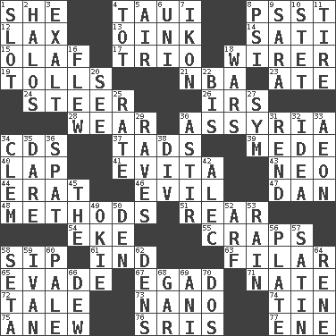 ACROSS 1. A female animal or person 4. "Change" in Tahitian 8. Inconspicuous attention getter 12. Not strict 13. Pig sound 14. Suttee (variant) 15. Norwegian king 17. Musical group of three 18. One who wires 19. For Whom the Bell _____ 21. Basketball assoc. 23. Had dinner 24. Guide 26. Big collection agency 28. Erode 30. Nineveh was its capital 34. Music discs 37. Small boys 39. Ancient Persian 40. Pet locale 41. Webber/Rice musical 43. Modern: prefix 44. Part of Q.E.F. 46. Tending to cause great harm 47. Daniel's nick name 48. Modes 51. Located in or toward the back 54. Supplement with great effort 55. Dice game 58. Small drink 61. Working for oneself (abbr.) 63. Of or pertaining to a thread or threads 65. Dodge 67. Mild oath 71. Nathan's nickname 72. Falsehood 73. Billionth: prefix 74. Metal container 75. Afresh 76. Indian titles of respect 77. Compass dir. DOWN 1. Notch 2. Saint headwear 3. Glorify 4. Small child 5. Atmosphere 6. Corn or form start 7. Picture 8. Air pressure measure (abbr.) 9. "Two Mules for Sister ____" 10. Proofreading order 11. Hoop that covers a wheel 16. Soared 18. Armed conflicts 20. Perceive with the eye 22. Again 25. Assign a rank or rating to 27. Symbol (abbr.) 29. All-night dance parties 30. Moving about 31. Tear apart 32. The content of cognition 33. A really long time 34. To starve (Brit.) 35. Have the gumption 36. Argument over a trivial matter 38. HTML Container Element 42. Actor Baldwin 45. Definite Article 49. Migrant worker of the '30s 50. Lair 52. Sandy's bark 53. Water falling in drops from the sky 56. Food holder 57. Smooth fabric 58. Stalk of a moss capsule 59. _ the terrible 60. Diluted with white 62. Cub Scout units 64. French philosopher Descartes 66. Morning condensation 68. Slender fish 69. Cuckoo 70. Two (Sp.)