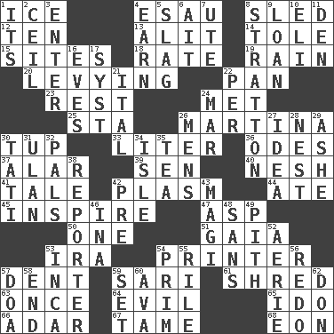ACROSS 1. Frozen water 4. He sold his birthright 8. Downhill vehicle 12. Nine, plus one 13. Came down and settled, as after flight 14. Lacquered or enameled metalware 15. Locates 18. Pace 19. Water falling in drops from the sky 20. Imposing or collecting, as a tax 22. Baking dish 23. State of inaction 24. Was introduced to 25. R.R. building 26. Chrissie's court nemesis 30. Uncastrated adult male sheep 33. 61 cubic inches 36. Lyric poems 37. Having or resembling wings 39. Elected rep. 40. Soft 41. Falsehood 42. Suffix with ecto or cyto 44. Had dinner 45. Motivate 47. Viper 50. Single 51. Greek goddess of the earth (variant) 53. Lyricist Gershwin 54. Hard copy producer 57. Scratch 59. Indian skirt 61. Fragment 63. At one time in the past 64. Tending to cause great harm 65. Wedding promise 66. The sixth month of the Jewish calendar 67. Docile 68. A really long time DOWN 1. It is 2. To provide with a ceiling 3. Keyboard key 4. Merit 5. Volcanic refuse 6. Small island 7. Shoshoni 8. Ski resort town in Vermont 9. Grant temporary use of 10. Biblical high priest 11. Lair 16. Nights before holidays 17. System (abbr.) 21. Slanted text style (abbr.) 22. For each 24. Third mo. 26. Not women's 27. The content of cognition 28. Egg locale 29. American tennis player Robert 30. Jacques of French films 31. Uhlan (variant) 32. Friends 34. Capri or Wright 35. Beverage made from leaves 38. Newsperson 42. Before (prefix) 43. Wise men 46. _ tizzy (2 wds.) 48. Without 49. Essential or central part 52. Nest on high 53. South American Indian 54. Demure 55. Cause heat under the collar 56. Make new 57. ___ good deed 58. Conclude 59. Put into a specified state 60. Actress Gardner 62. Spanish title