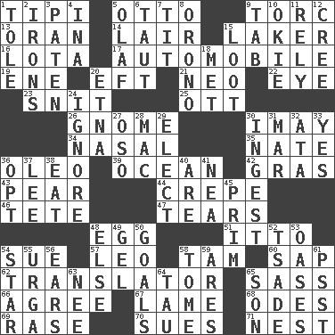 ACROSS 1. Native american tent (variation) 5. Von Bismarck 9. Torque (variant) 13. NW Algerian seaport 14. Den 15. Member of a famous L.A. basketball team 16. Globular water bottle used in Asia 17. Car 19. Compass dir. 20. Bank Draft (abbr.) 21. Modern: prefix 22. Sight organ 23. In a ____ (agitated or irritated) 25. Baseball player Mel 26. Dwarf 30. "If ____ say so..." 34. Relating to the nose 35. Nathan's nickname 36. Margarine 39. Sea 42. Pate de foie ____ 43. Lightbulb-shaped fruit 44. Streamer paper 46. False hair 47. Pulls apart 48. Ovum 51. "Tell ____ the Marines!" 54. Institute legal proceedings 57. Lion 58. Scottish cap 60. Plant excrement 62. Interpreter 65. Backtalk 66. Match 67. Unable to walk 68. Lyric poems 69. Raze (variant) 70. Institutes legal proceedings 71. A home for chicks DOWN 1. Lacquered or enameled metalware 2. Metal shackles 3. Eucharist need 4. _ tizzy (2 wds.) 5. Norwegian king 6. Tense 7. Teat (slang) 8. U. of Maine site 9. Bar bill 10. Migrant worker of the '30s 11. Trust 12. Algonquian 15. Spoils 18. Was introduced to 20. Inactive volcano in Sicily 24. Fail to notice 27. Bear (Spanish) 28. Big _ 29. Voters do this 30. Consume 31. Make imperfect 32. _ moment's notice (2 wds.) 33. Consenting reply 36. Choose 37. Area sheltered from the wind 38. Consume 40. "We ___ not amused" (Victoria) 41. Teachers' org. 45. Demure 48. Otherwise 49. Set 50. Scores awarded for successful feats 52. Sadhe (variant) 53. Fertile tracts in a desert 54. Play the lead 55. Capital and largest city of Mongolia 56. Hearing organs 58. Heavy book 59. Ancient Greek god of war 61. Inconspicuous attention getter 63. Born 64. The 19th letter of the Greek alphabet 65. Boy, to dad