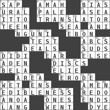 ACROSS 1. Plant excrement 4. Wet nurse 8. Prejudice 12. Mountain range 14. Light colored 15. At sea 16. "Tell ____ the Marines!" 17. Interpreter 20. Adolescent 21. Ocean 22. Black tropical American cuckoo 23. Group of southern Bantu languages 27. Inky black, to poets 29. Trial 31. Lettered men learn these first 34. Allots cards 35. Beer foam 36. "You Light Up My Life" star Conn 39. Ewer handle 41. Otherwise 42. Arabian gulf 43. Flat circles 46. Actor Lugosi 47. Writer Wiesel 48. Length times width 51. Eat (away) 54. Soggy 56. Followers of ems 58. So be it 61. The property of being fit to eat 66. Redecorate 67. Small Philippine buffalo 68. Singles 69. Conclusions 70. Long (Scottish) 71. Gone 72. Color DOWN 1. Set or collection 2. Johnson of "Laugh-In" 3. Eucharist need 4. Fitting 5. Impair 6. Insect wing 7. Coop moms 8. Sound made by sheep 9. Byzantium, centuries later 10. A really long time 11. Indian skirt 13. Having great length 18. Observe 19. Experiment locale 24. Shoshoni 25. Teachers' org. 26. Small island 28. Fertile tracts in a desert 30. Sadhe (variant) 32. Music discs 33. Compass dir. 34. Middle Eastern gold or silver currency 36. Pat or tap gently 37. Binary compound 38. Accusation by an informer 40. Cause heat under the collar 44. Title for a knight 45. Corporate head (abbr.) 49. Snakelike fish 50. A saturated hydrocarbon 52. Have the gumption 53. Make improvements or corrections to 54. Welt 55. Pulitzer Prize-winning author Ferber 57. Overwhelm 59. Whirlpool 60. Sense of smell 62. Container for groceries 63. Compass dir. 64. Elected rep. 65. Fast jet (abbr.)