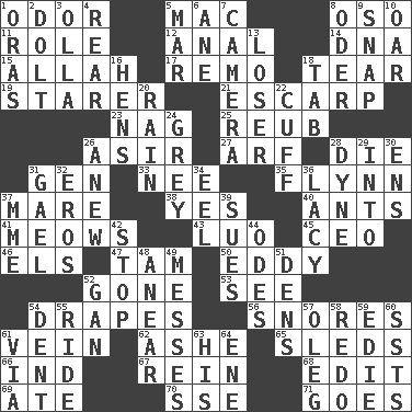 ACROSS 1. Scent 5. Apple computer (short form) 8. Bear (Spanish) 11. Hero or heavy, e.g. 12. Of or related to the anus 14. Heredity factor (abbr.) 15. Assad's deity 17. San ____ (Riviera town) 18. Pull apart 19. A viewer who gazes fixedly 21. Fortification 23. Tired old horse 25. Reuben's nickname 26. SW Saudi Arabia district 27. Sandy's bark 28. Expire 31. Commissioned mil. rank 33. Born 35. Film actor Errol 37. Female horse 38. Consenting reply 40. Pismires 41. Catcalls? 43. Nilotic language 45. Corporate head (abbr.) 46. Raised railways 47. Scottish cap 50. Whirlpool 52. Went 53. Perceive with the eye 54. Window treatments 56. Sounds asleep 61. Distinctive style or manner 62. American tennis player Robert 65. Bobsleighs 66. Working for oneself (abbr.) 67. It's straight from the horse's mouth 68. Prepare for publication 69. Had dinner 70. Compass dir. 71. Moves DOWN 1. Mouths or openings 2. Dunce 3. Spanish pot 4. Tail end 5. Third mo. 6. A saturated hydrocarbon 7. Device for capturing images 8. River in Europe 9. Fastener 10. Boat paddle 13. Failure 16. Coop moms 18. Bar bill 20. Water falling in drops from the sky 22. Sleeve end 24. Jennifer or Joel 26. Afresh 28. Unit of force 29. To the inside or interior of 30. Followers of ems 31. Highlander 32. Greek god of love 34. Snakelike fish 36. Made of lace 37. Madame (abbr.) 39. Institutes legal proceedings 42. Halt 44. Lyric poems 48. Approach 49. Makes clutter 51. Habitations of wild animals 52. Separate the seeds from cotton 54. Incision 55. Travel on an animal 57. Cassini of fashion 58. Redecorate 59. Singer Brickell 60. Fast planes 61. By way of 63. Part of HMS, perhaps 64. Compass dir.